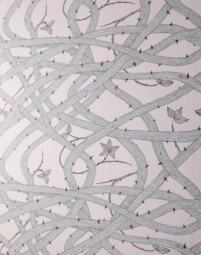 Brambleweb is a hand drawn design of never ending tangled brambles with metallic thorns, creating art nouveau shapes with a slightly Gothic edge and creating the effect of being nestled in a bramble thicket.