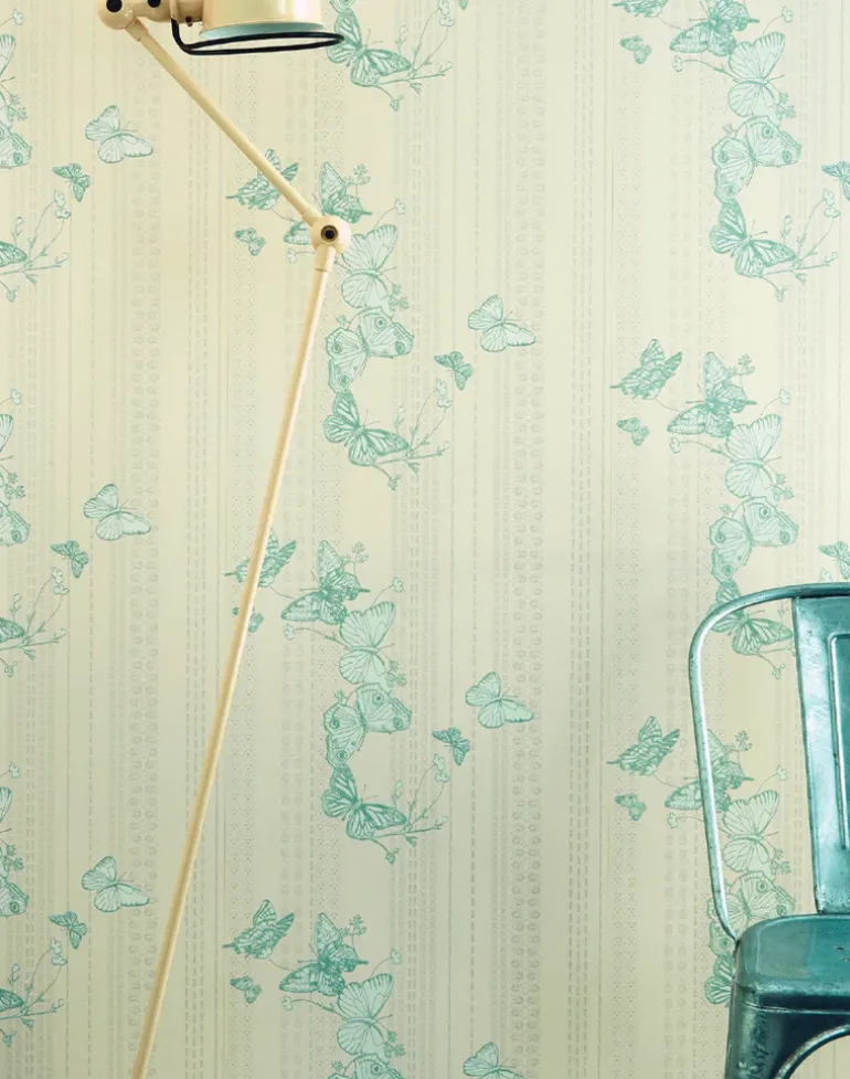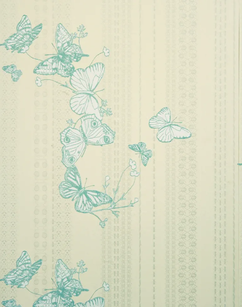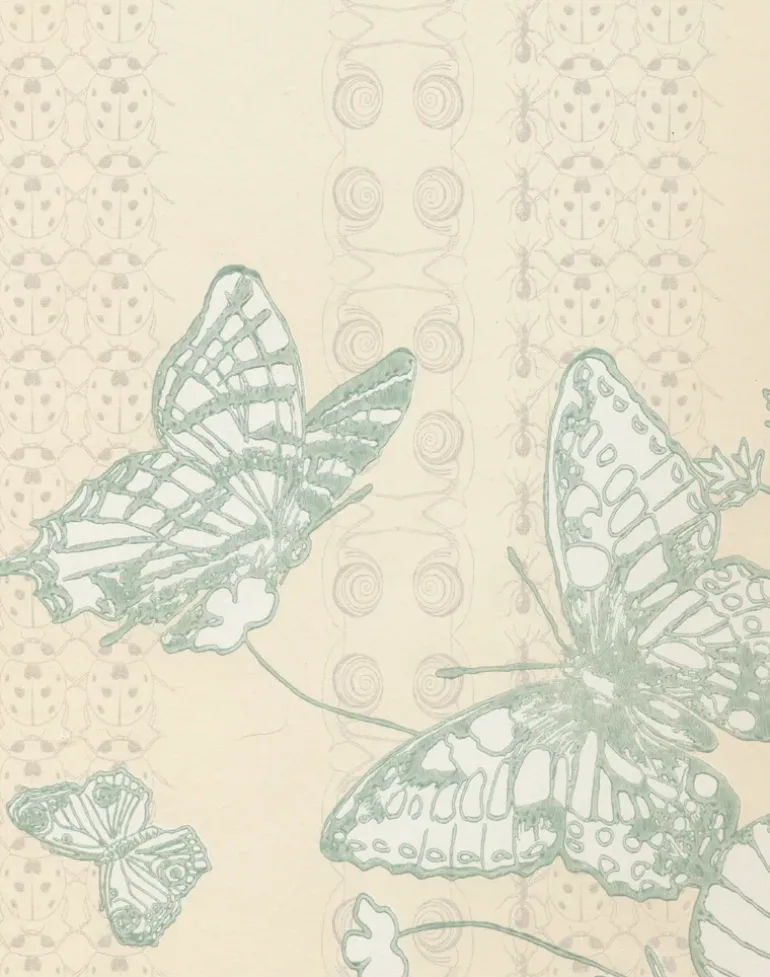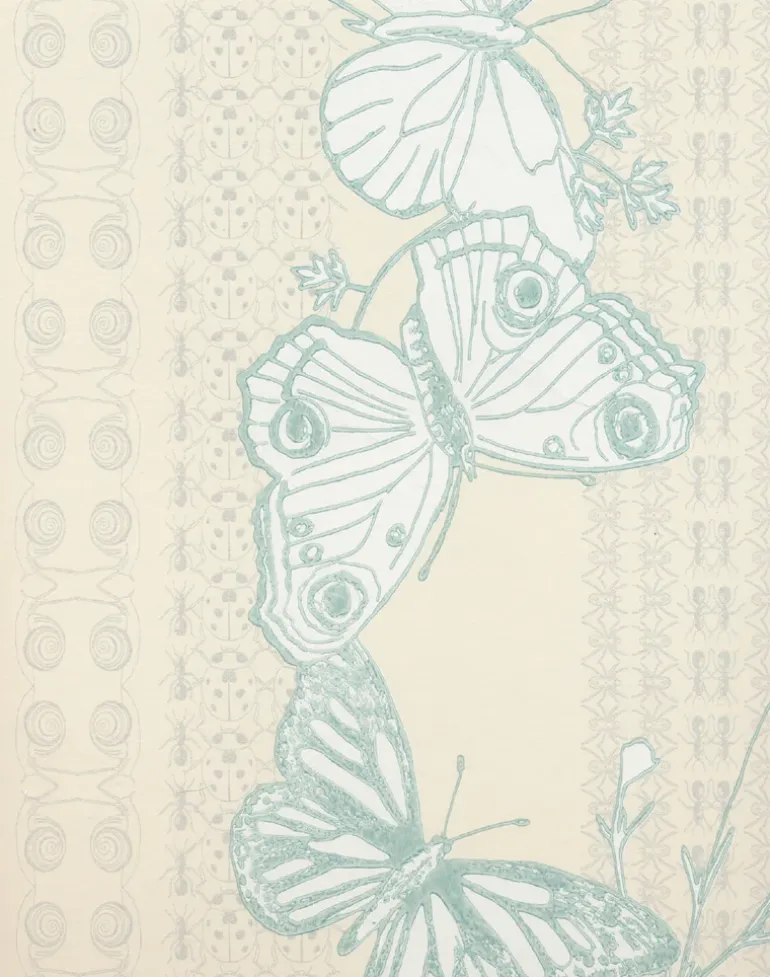 Butterflies on a soft silvery lace stripe which, on closer inspection, reveals spiders, ladybirds, ants and centipedes marching up the paper.