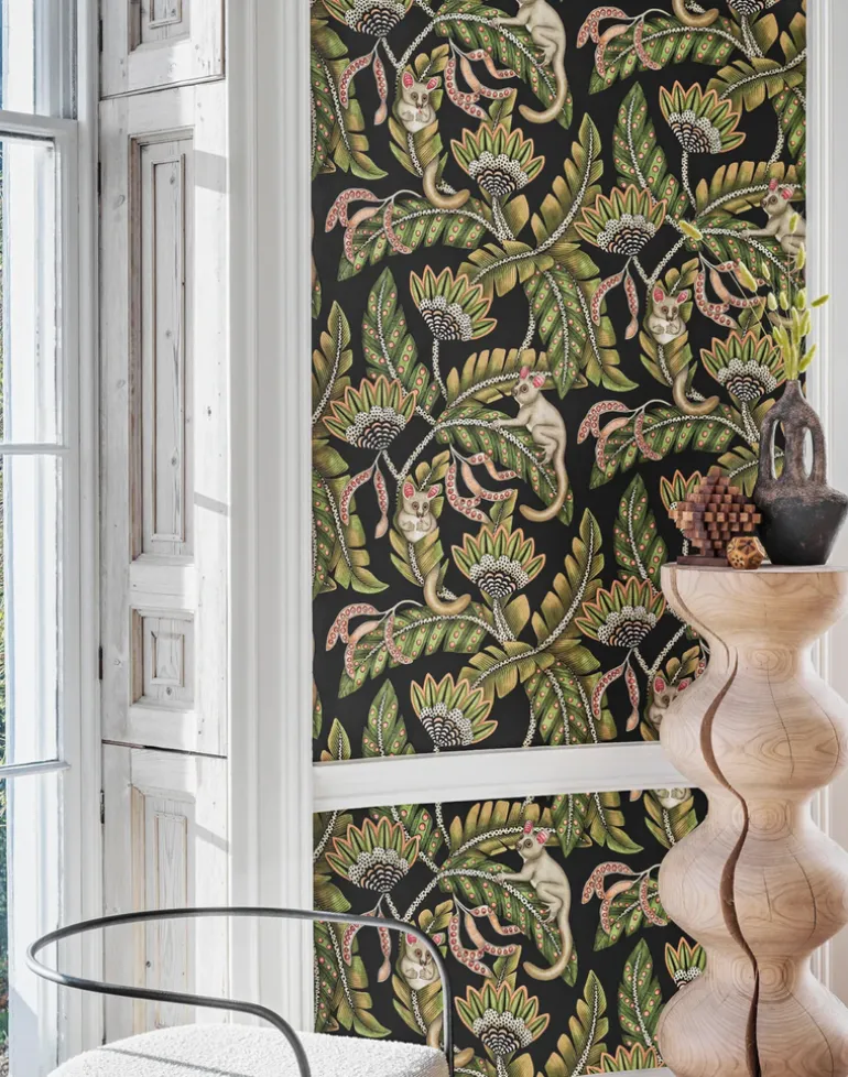 Immerse yourself in the whimsical world of Ardmore’s Bush Baby Wallpaper, where playful bush babies frolic amidst lush African Coral trees. This captivating wallcovering is a symphony of rainforest greens, accented with bursts of scarlet and orange, reflecting the vibrant spirit of the African wild. With its rich wine and serene aquamarine tones set against nocturnal inky backgrounds, this wallpaper brings an enchanting, luxurious touch to any interior, embodying the essence of Africa’s natural beauty.