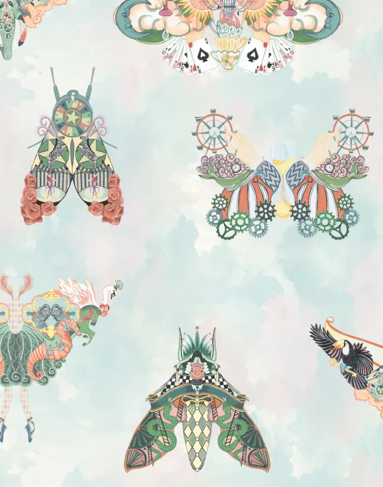 Balancing Act wallpaper by Brand McKenzie features a stunning range of animals and birds, including flamingos, toucans, zebras and leopards, all balancing on a network of branches against a vivid sky and cloud background. This bold and colorful design adds an element of fantasy to any space, making it the perfect choice for those looking to add some personality to their walls.