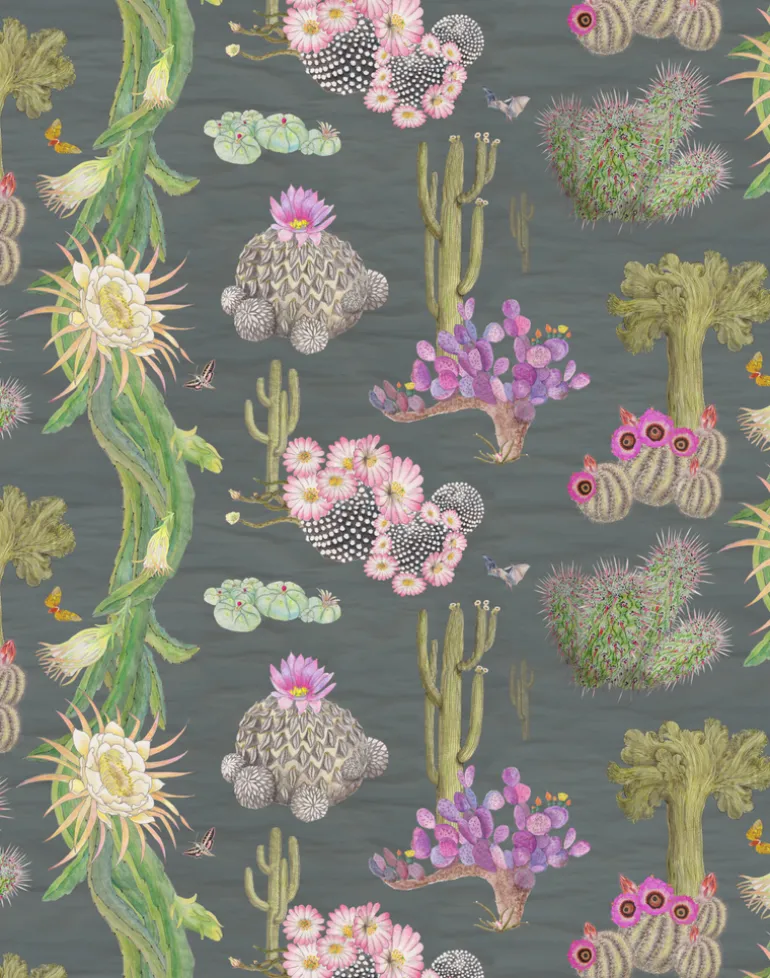 This design is the culmination of several years Dr Susy Paisley spent living in, and besotted with, Mexico. It celebrates the incredible diversity of Mexican cacti. Mexico is one of the world’s centre of endemism for this group of plants, and includes marvels like the Creeping Devil, a cactus in this design which actually moves across the desert floor! Cacti are enjoying a new popularity, but globally, one out of three cacti is in need of conservation attention. The design includes the Chisos Mountain hedgehog cactus, hallucinogenic Peyote, a critically endangered dragonfruit, which forms the long tendrils in the design, and lesser long-nosed bat (an essential pollinator for cacti) and the iconic saguaro and crested saguaro cacti.