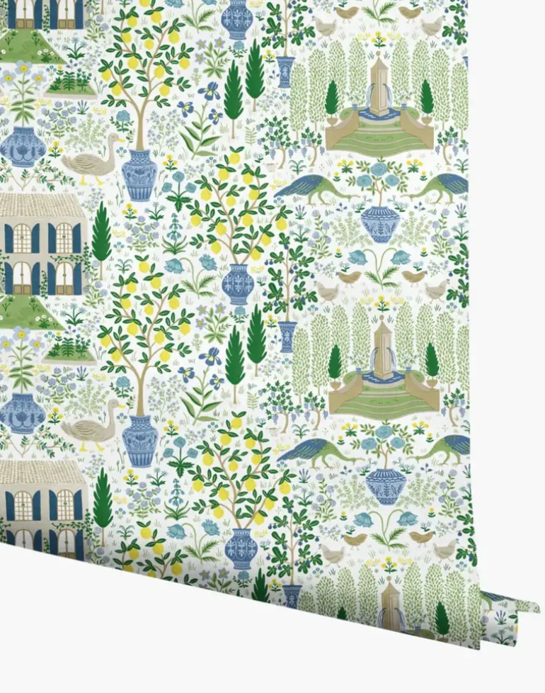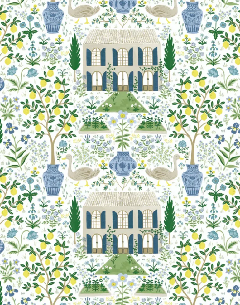 Inspired by an 18th-century farmhouse in Gascony, France and an antique pattern from York’s archives, Camont features illustrated fig trees, lemon trees, chickens, and flowers of its pastoral grounds. This wallpaper is gravure printed and comes in 27 inch rolls with a 20.5 inch repeat.