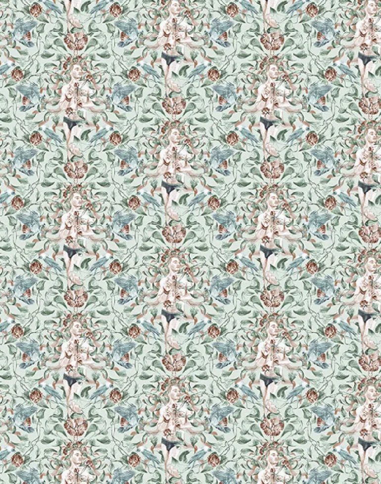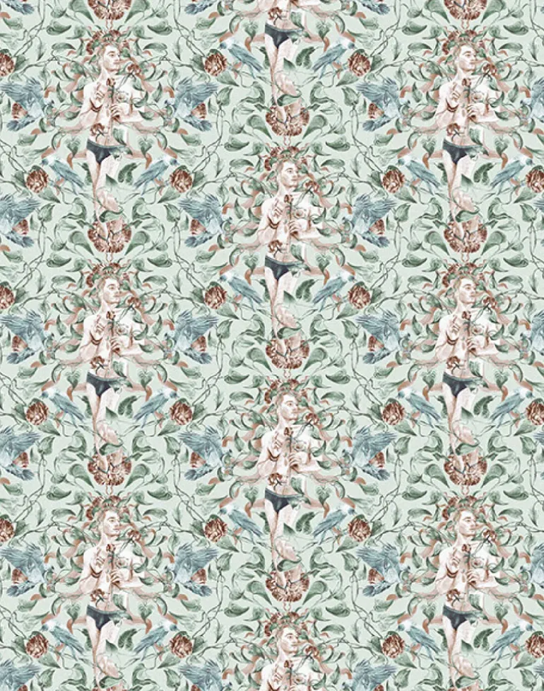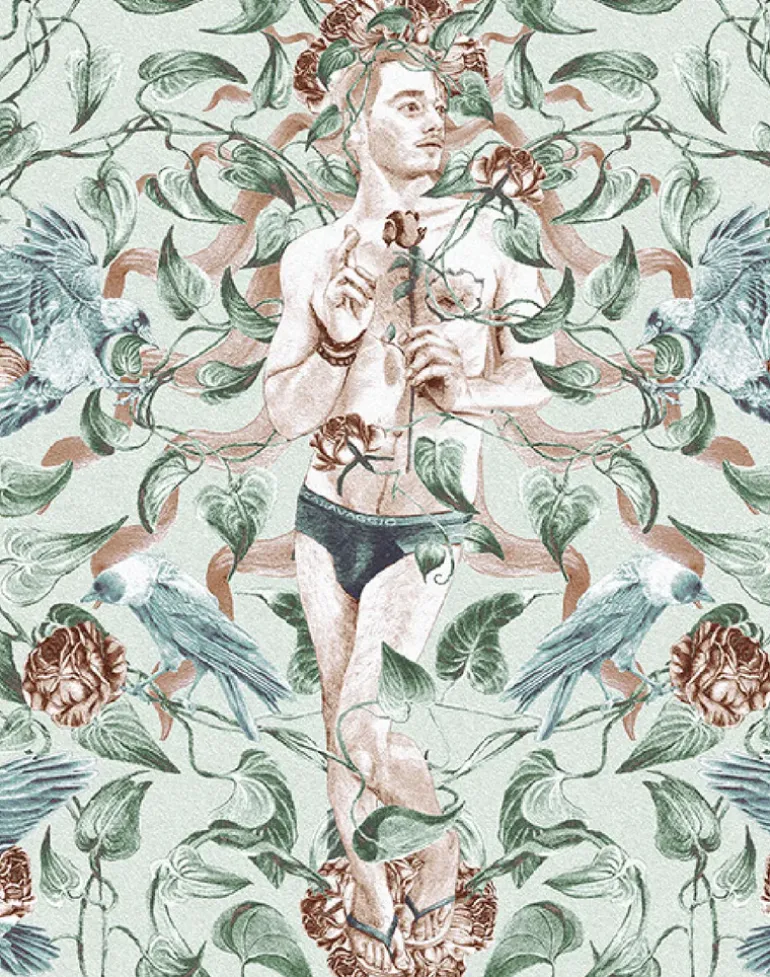 As loving brother to Jewelled Venus. An up to date version of Caravaggio’s Bacchus, totally modern in flip flops and Y fronts whilst channeling the past with saintly gestures.