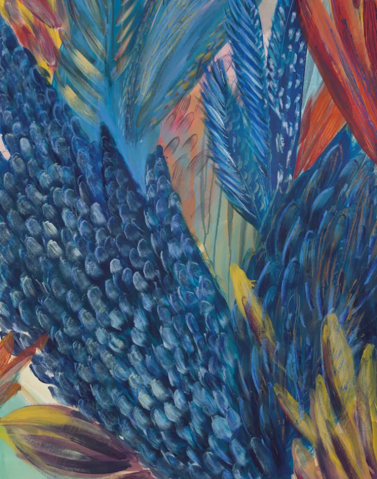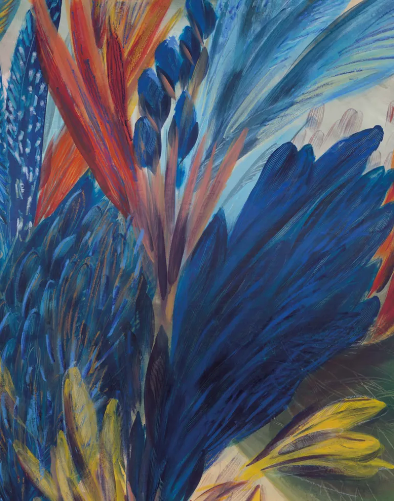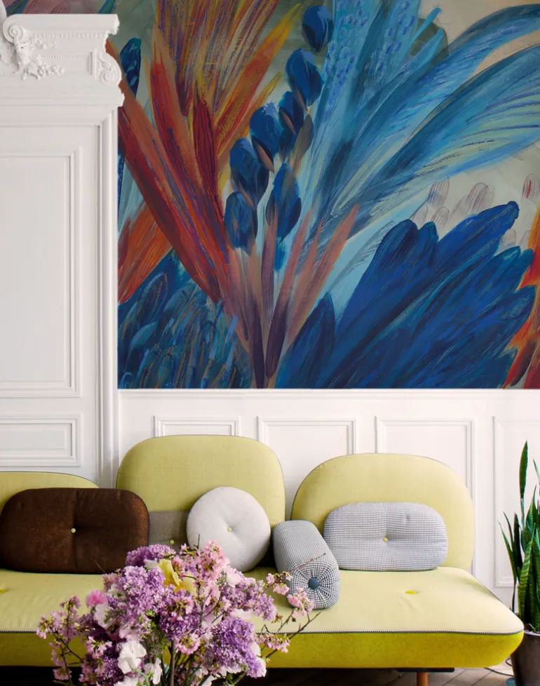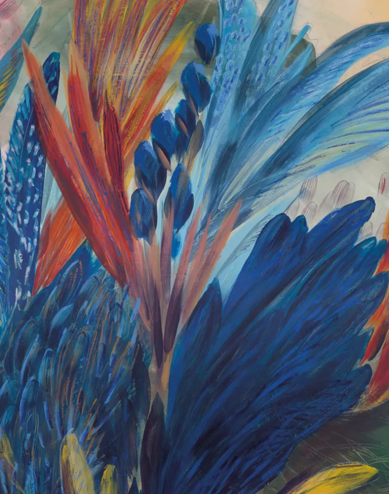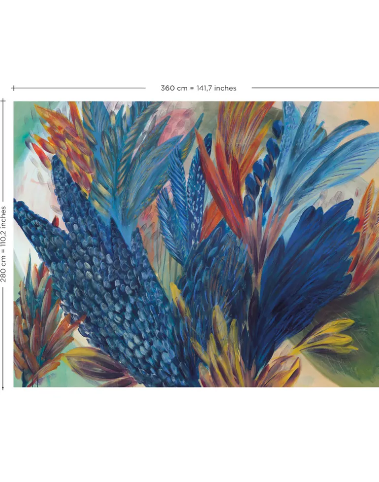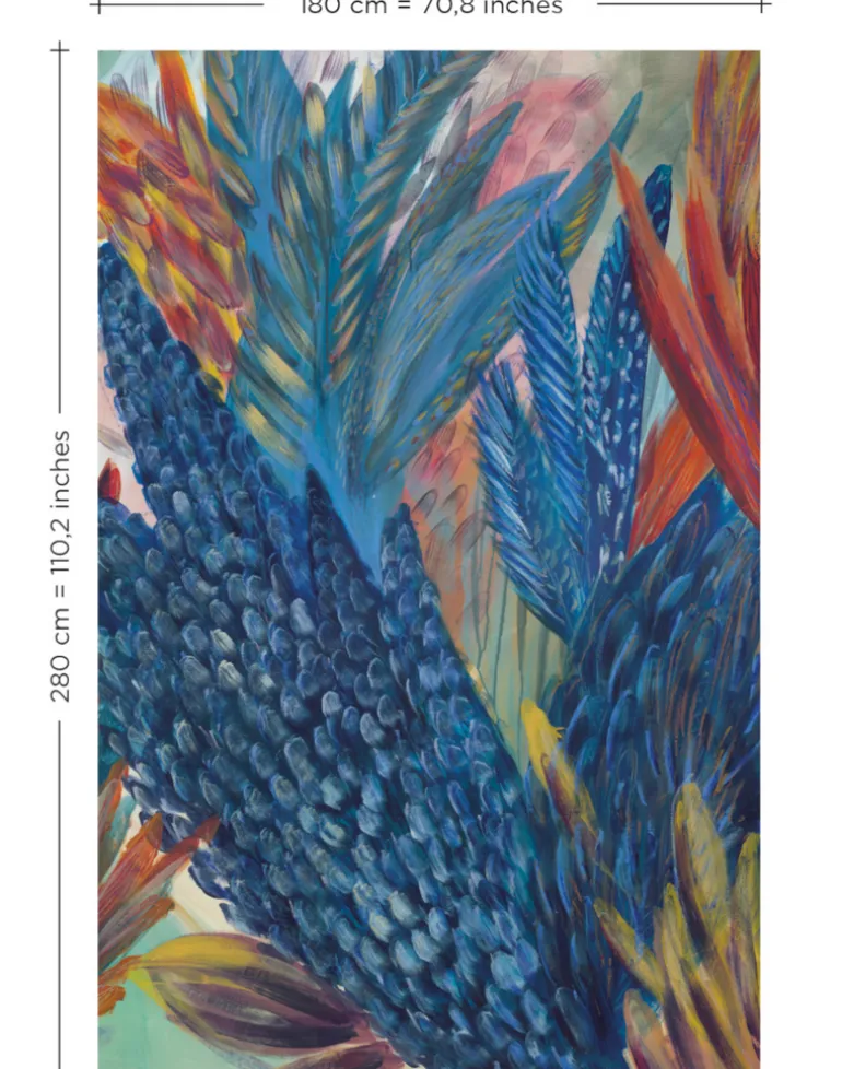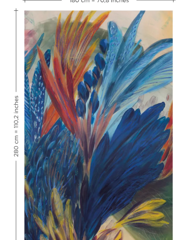 Powerful and expressive, the Carla wallpaper presents a real graphic composition painted by the French artist Carla Talopp. Visible, the lines of the brush give these majestic foliage and feathers an impression of movement. Imagined in warm and nuanced colors, this wall covering produced by Bien Fait offers an invigorating touch to the spaces that host it.