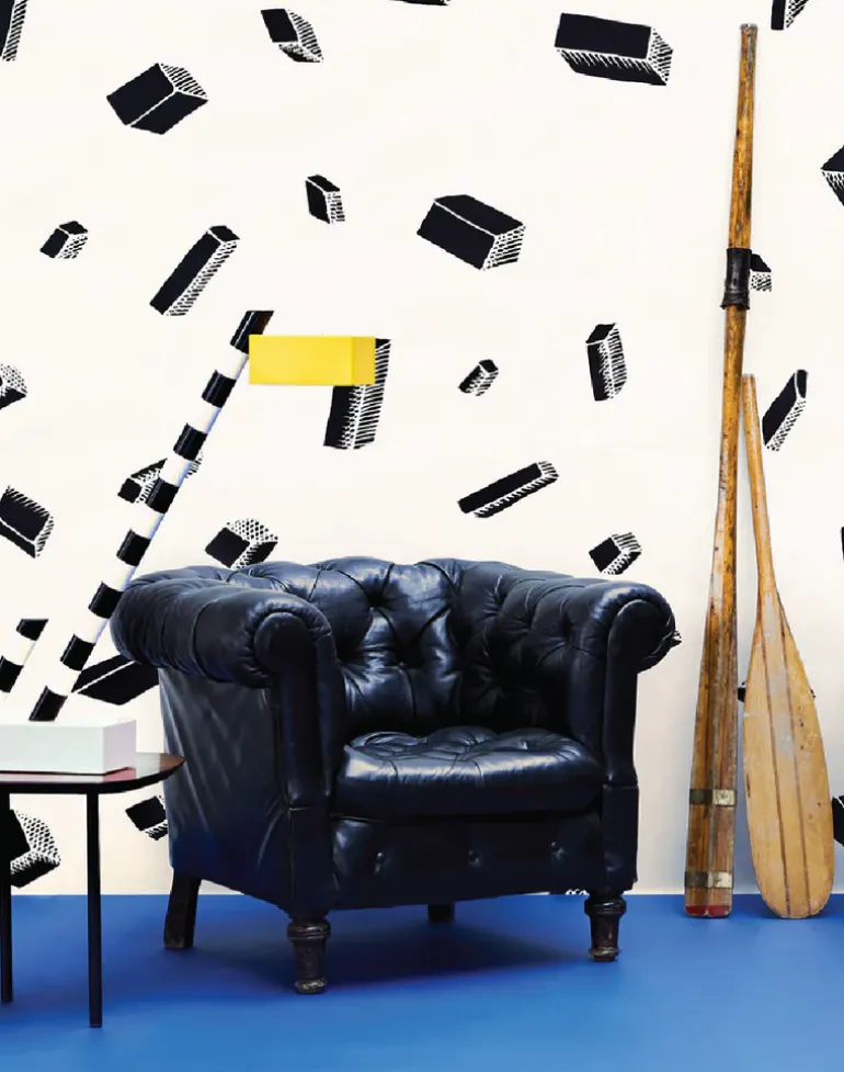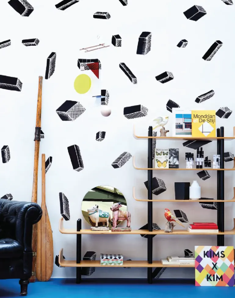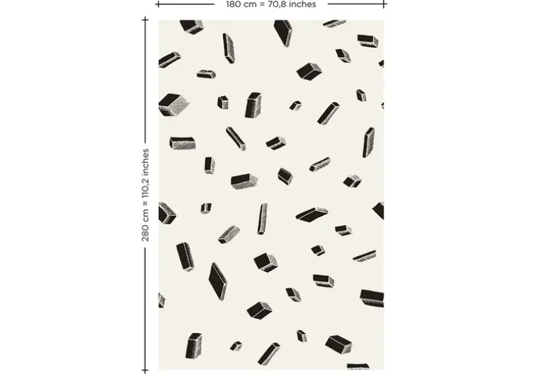 Fun and chaotic, the blocks seem to be floating and swirling around freely. This new design is available in several colors, on a light or dark background. It draws inspiration from the precision and imagination required for construction toys, and above all the Memphis group and Ettore Sottsass’s famous bookshelf.