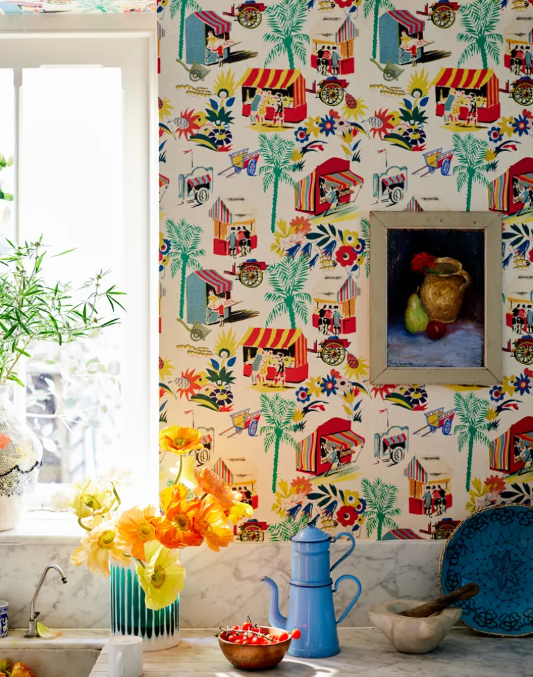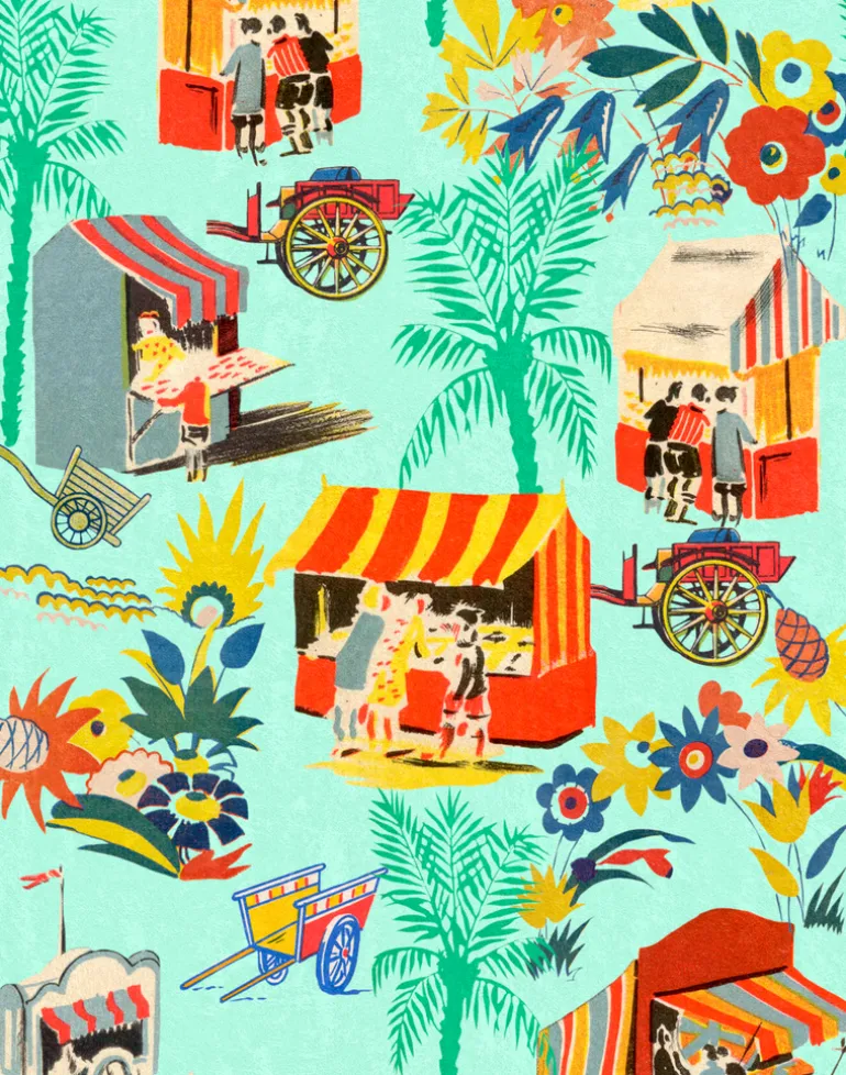 The echoes of a bustling Sicilian market, where every corner is alive with the sights, sounds, and colors of a vibrant cityscape, is encapsulated in CARRETTO DEL CIBO. An ode to Italy’s lively streets, with whimsical elements mingling with charming vignettes that create a true tapestry of life. Carts laden with goods trundle along the streets, while colorful banners flutter in the wind, adding a touch of playfulness to the scene. Set against a plain light beige background, the vibrant hues of CARRETTO DEL CIBO truly come to life, creating a striking contrast that draws the eye and captures the imagination. This pattern is also available with a light baby blue background.