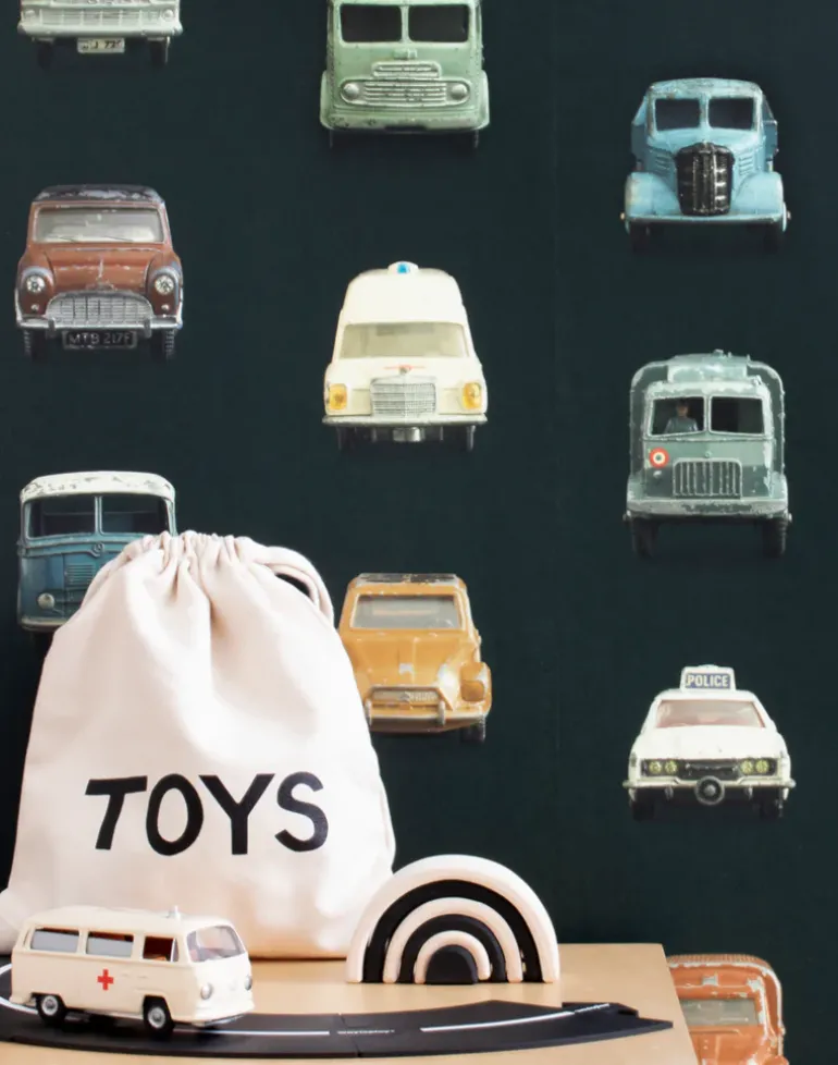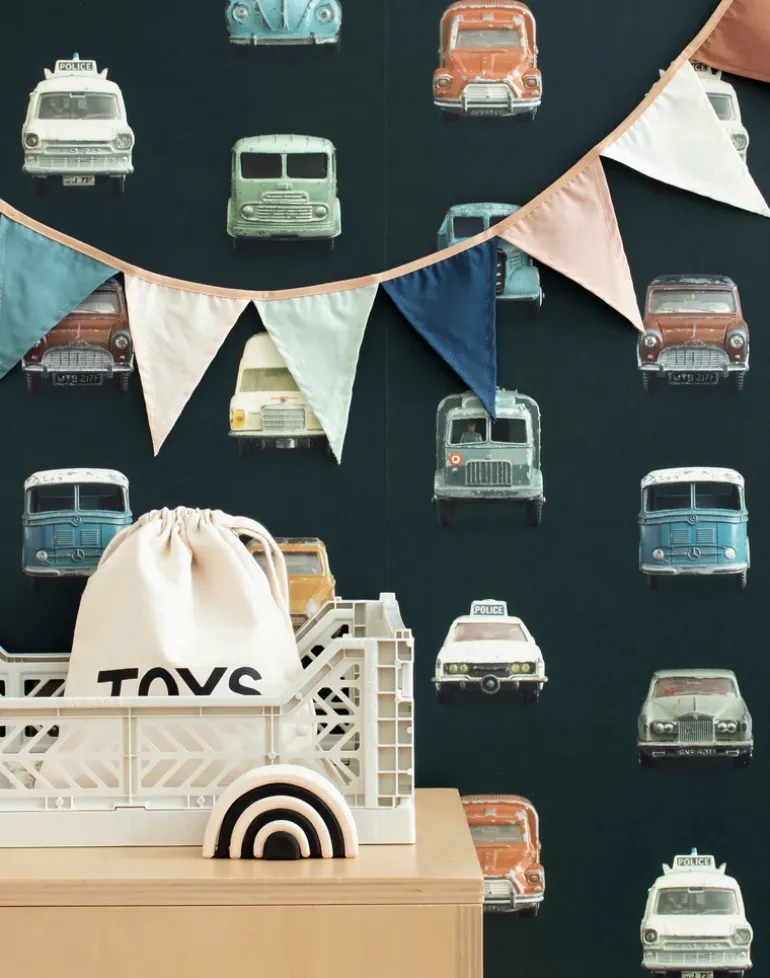 Studio Ditte cars wallpaper with a dark background. This wallpaper with vintage cars shows a history of playful amusement. Grandfathers, dads and sons let these oldtimers race and crash with lots of fun. The cars are damaged and only became even cooler. Kids wallpaper with vintage look for the nursery.