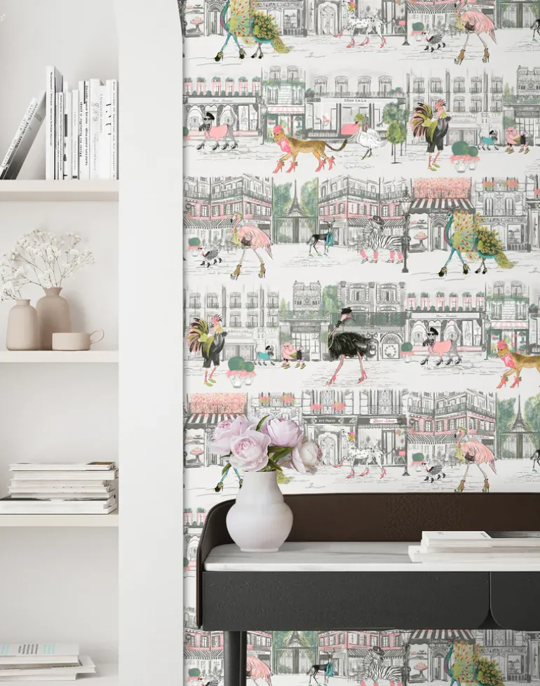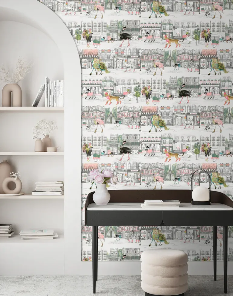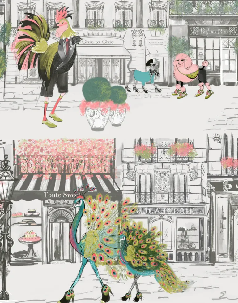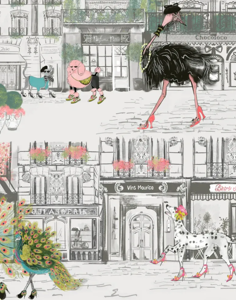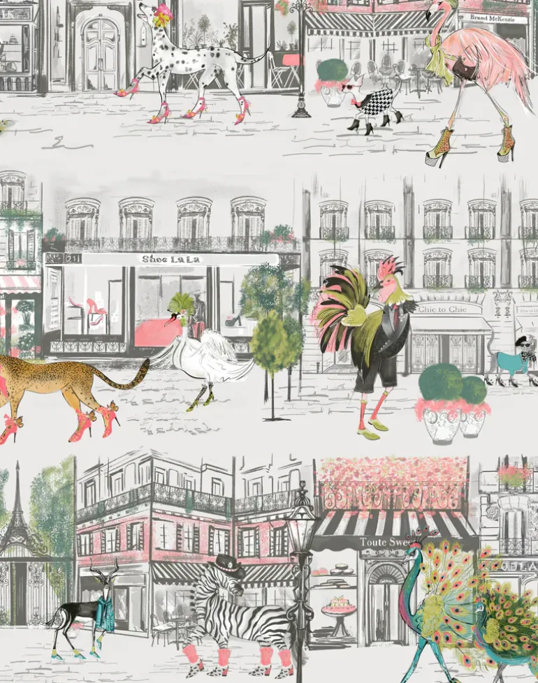 Drawing inspiration from the world of fashion illustration, our Catwalk wallpaper is a vibrant tableau that captures a stylish parade of fashionable animals elegantly strutting through the enchanting streets of Paris. Each creature is dressed to impress in fabulous footwear and accessorized with chic touches like neck scarves, hats, and sunglasses. These fashionable animals exude an air of grace and sophistication, turning walls into a lively runway where elegance meets whimsy.