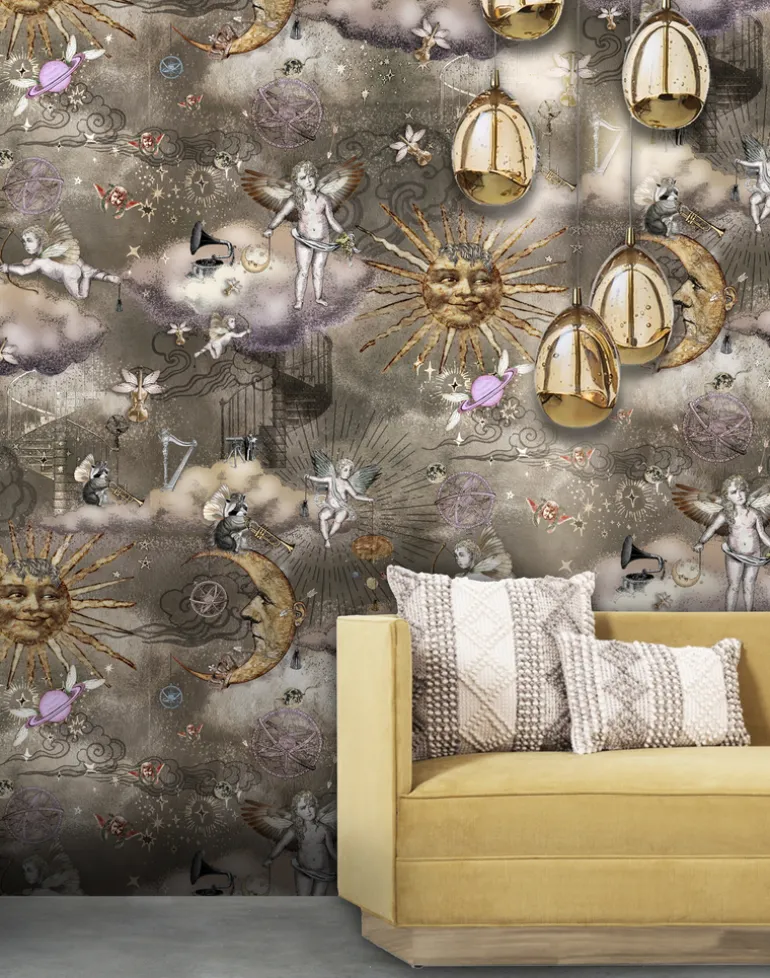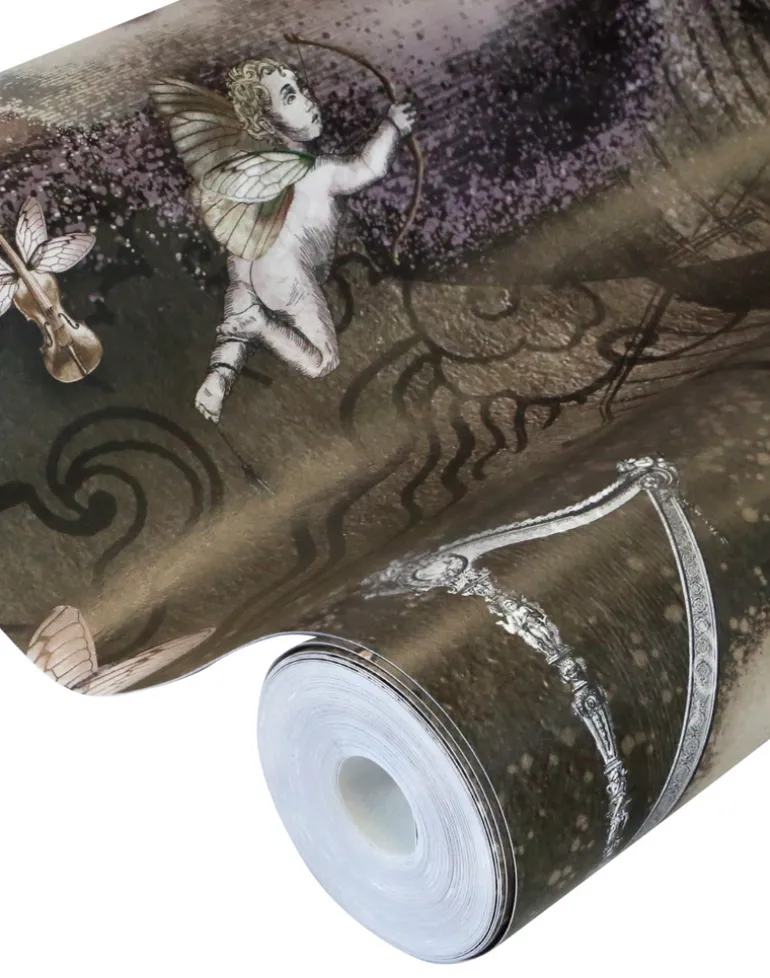 Be taken to cloud 9 with this dreamy wallpaper print. Cupid and his ensemble of cherubs will whisk you off your feet to dance with the sun and the moon. Waltz your way around dreamland while the illusory orchestra strike up the band. Don’t forget to climb the spiral stairway to heaven, which you can find hidden in the shadowy black background, only to be seen when the clouds part ways. A truly imaginative wallpaper which will transport your room far, far away.