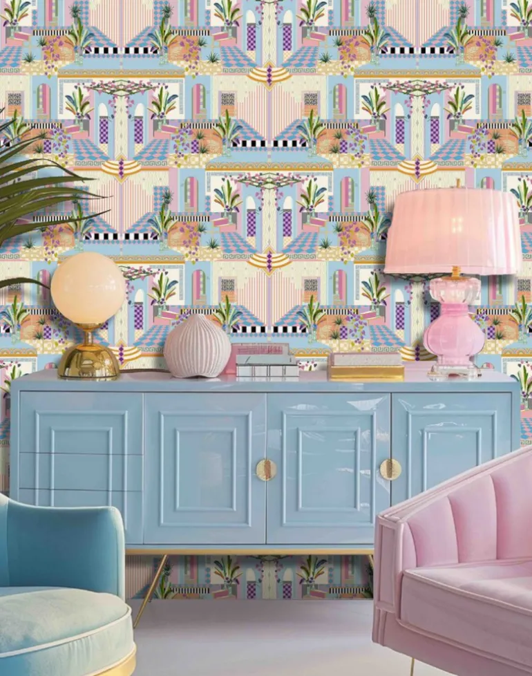 Make them stare with this statement Art Deco inspired wallpaper. Chatelaine has everything…arches, plants, stripes, checkerboards and masses of FUN! It’s a bold maximalist wallpaper design that is just pure magic and bound to create a stir in any space. It’s bold, it’s joyful, it’s a little bit bonkers.