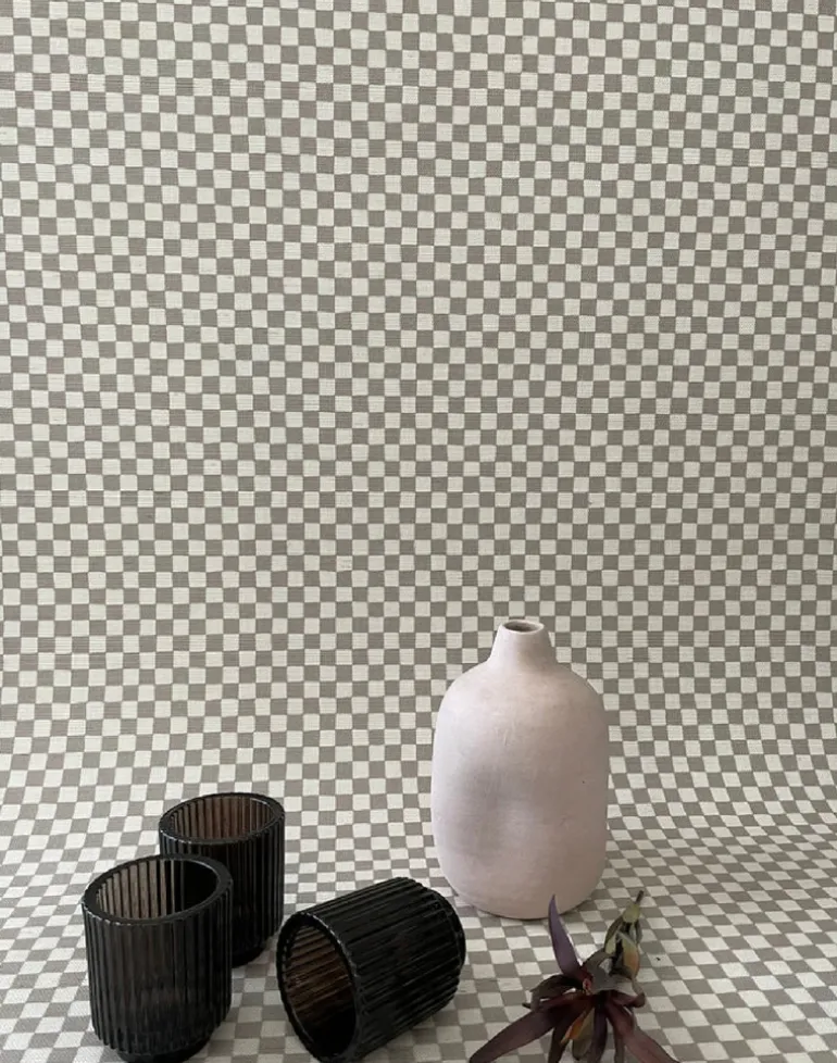 Checker is a hand-painted checkerboard printed onto grasscloth in nostalgic hues.