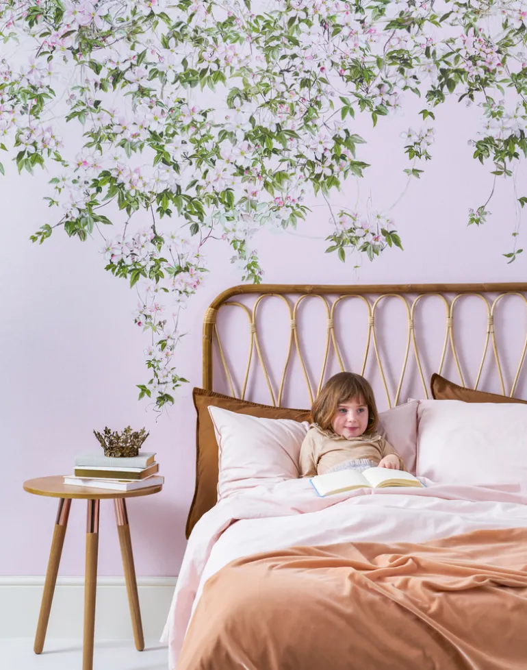 The Clematis Wallpaper Mural depicts romantic, hand-painted flowers, spilling over the side of a garden wall like a scene from sleeping beauty, where time slips away and you can escape into a magical realm.