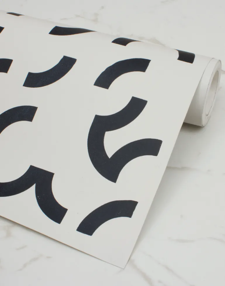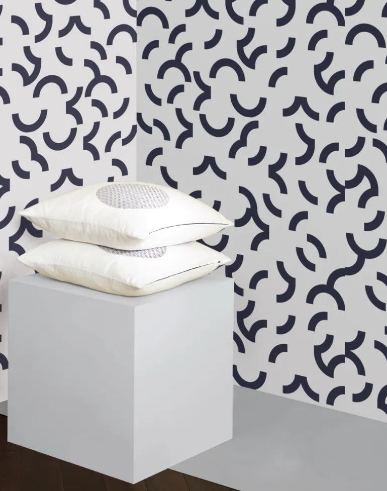 and divisions of sports courts. Contour is a screen printed wallpaper that sits alongside an embroidered textile collection further exploring the movement and energy of the print.