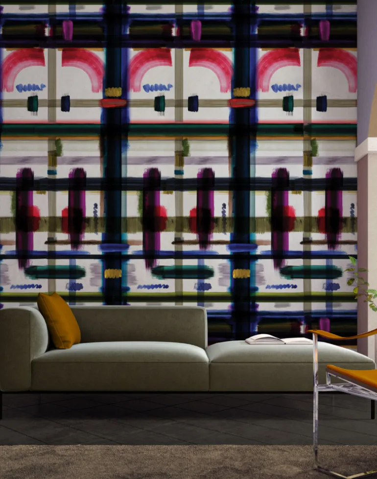 Corinthian Check is a playful reimagining of elements of classical architecture. Orderly geometric shapes are loosely rendered in broad strokes of pigment colour, giving an abstract impression of what could be arches, windows and doorways. This large-scale design was inspired by the notion of a transient city made of pigments and inks. Rendering classical concepts of proportion with free and open marks and a joy of colors, a vast watery city looms as if it were a mirage in the hazy distance, setting a visionary, theatrical backdrop.