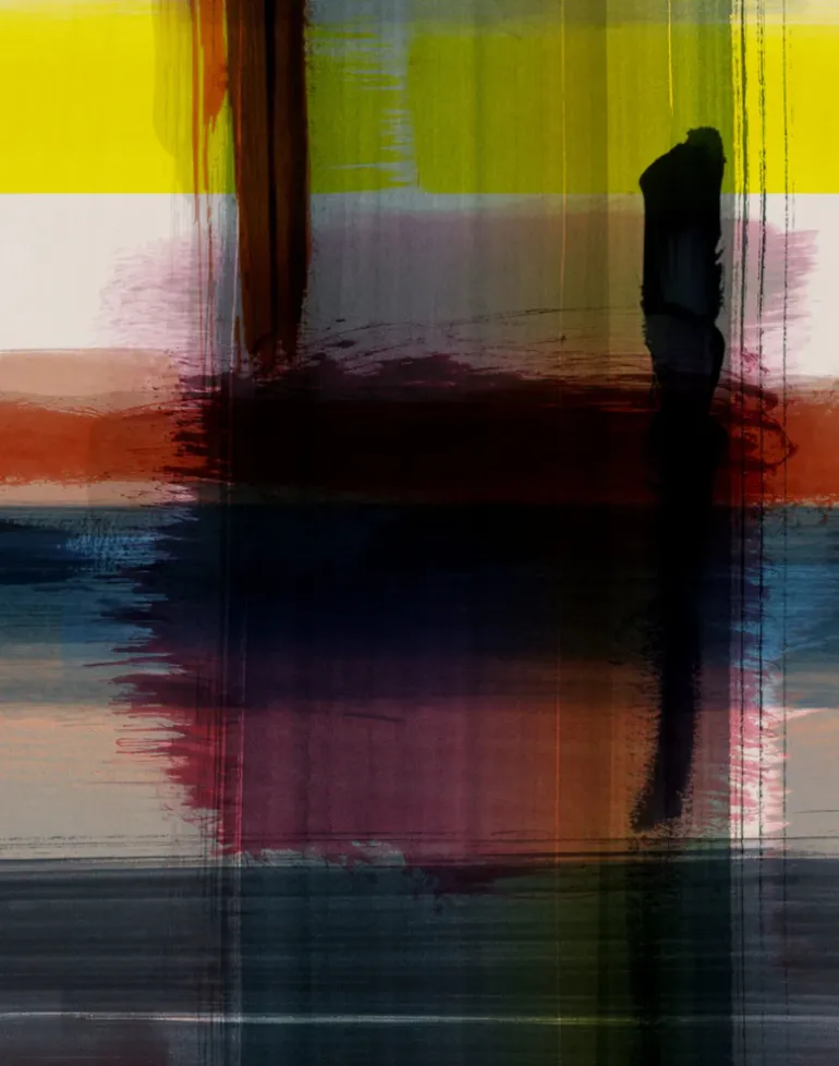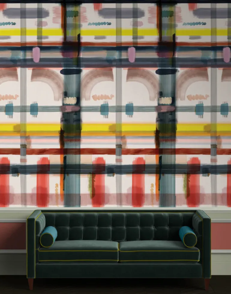 Corinthian Check is a playful reimagining of elements of classical architecture. Orderly geometric shapes are loosely rendered in broad strokes of pigment colour, giving an abstract impression of what could be arches, windows and doorways. This large-scale design was inspired by the notion of a transient city made of pigments and inks. Rendering classical concepts of proportion with free and open marks and a joy of colors, a vast watery city looms as if it were a mirage in the hazy distance, setting a visionary, theatrical backdrop.