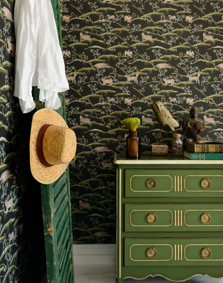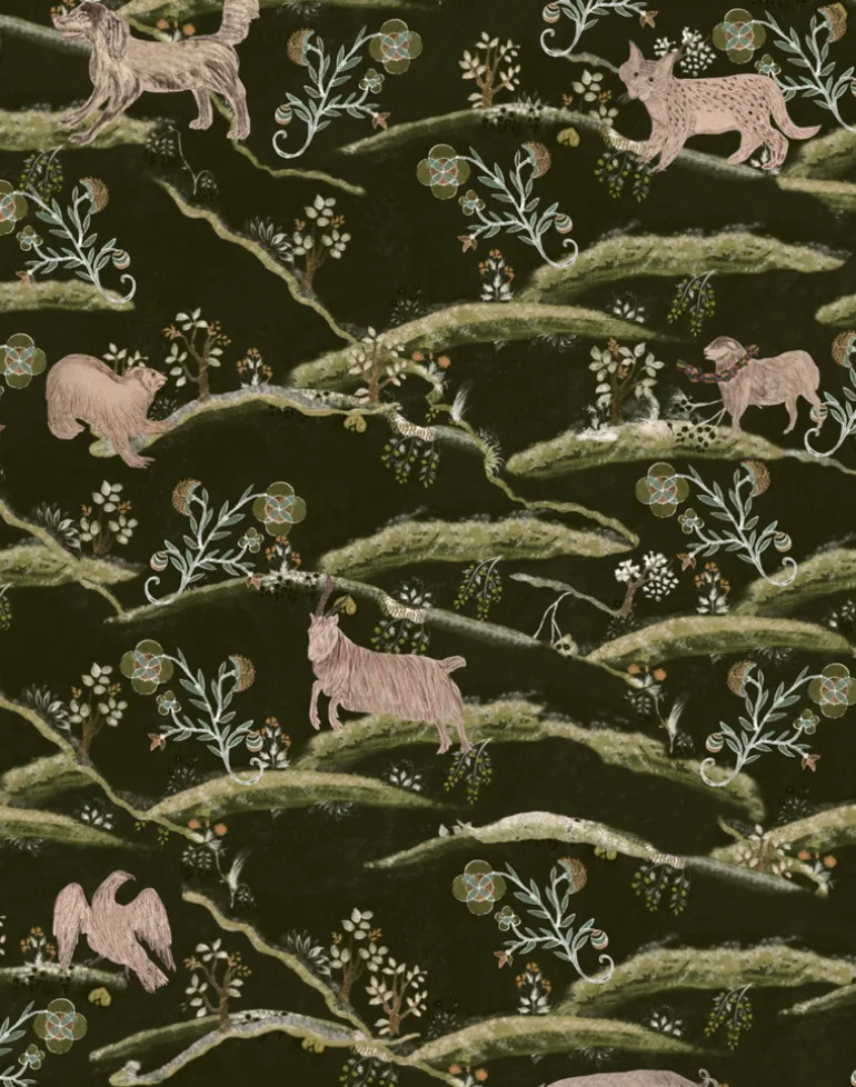 The Countryside wallpaper is an homage to all life bestowed upon our prosperous lands. A beautiful naive folk illustration with wild and domestic animals in a composition inspired by early local culture. Available in two tones: daylight or by night.