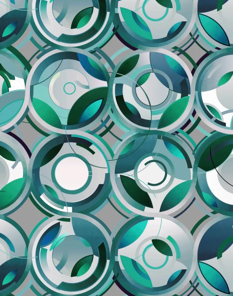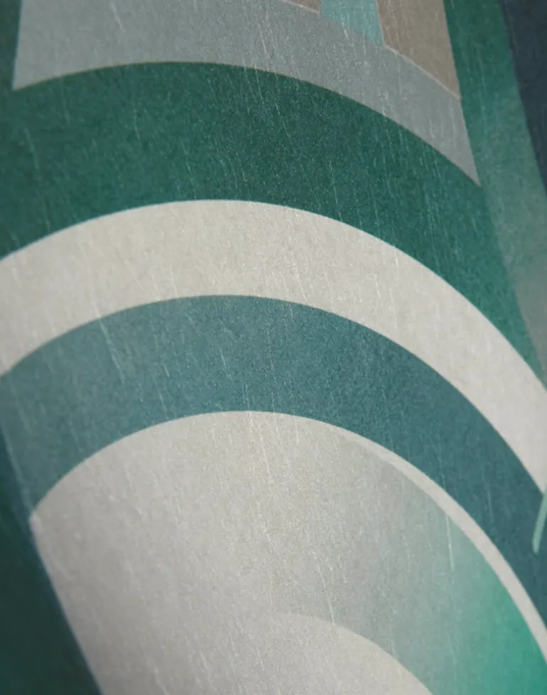 Cylinders is a dramatic reinvigoration of the timeless, geometric elegance of Art Deco. Taking the circle as the basic form, this shape is energised through dynamic interplay and seemingly endless variations upon a theme. Inspired by technological development, this design is a paean to progress and innovation. Water-based inks give the coloration a painterly effect, creating gradations and combinations that suffuse the design with a sense of depth. Printed onto super-wide rolls, this expansive, futuristic design seems to push the boundaries of the possible.