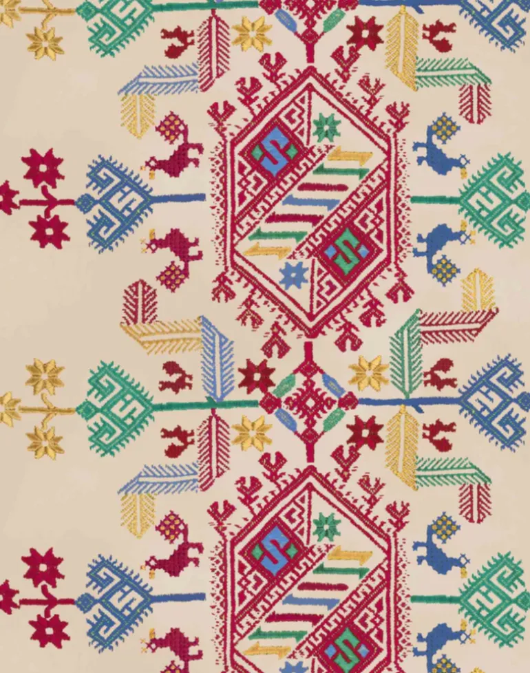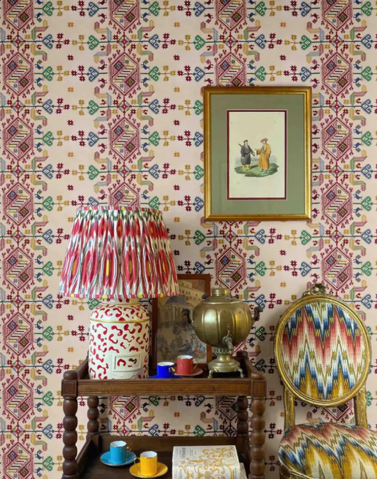 This warm chalky cream based wallpaper exudes a wonderfully tactile and joyfully colorful mood, being inspired by an antique cloth from along The Silk Road. A wallcovering that is ideal for creating a bohemian and cozy yet statement interior. In a room it will infuse eclectic allure, warmth and charm whether an entrance, a hallway, a dining room or a cloakroom. Damas is part of Milola Design’s Silk Road Collection and will be launching more colorways in the near future.