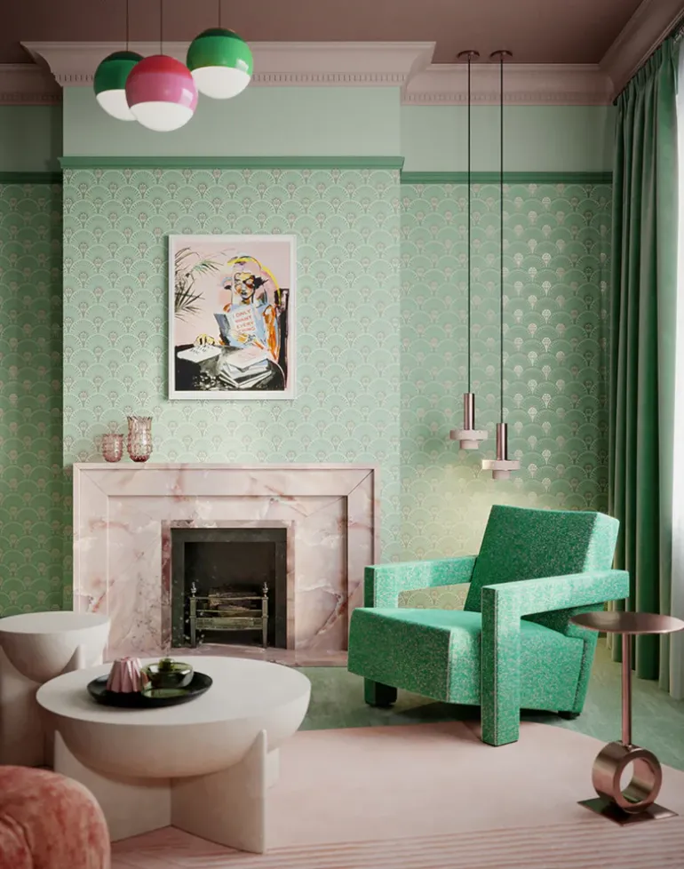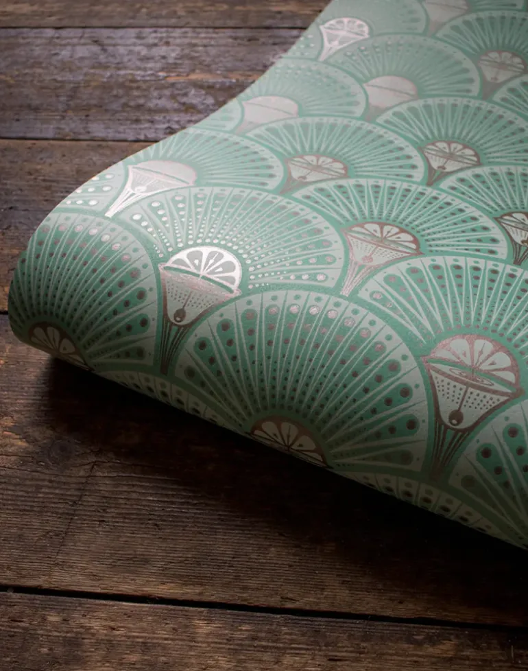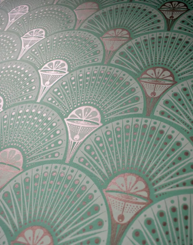 An Art Deco wallpaper that brings Gatsby glamour to your home, with exquisite colors of cool mint and soft blush copper. We love this as a living room wallpaper, but it can work anywhere in the home you want to add pattern. This colorway was inspired by the intricately engraved rollers the wallpaper is traditionally printed with.