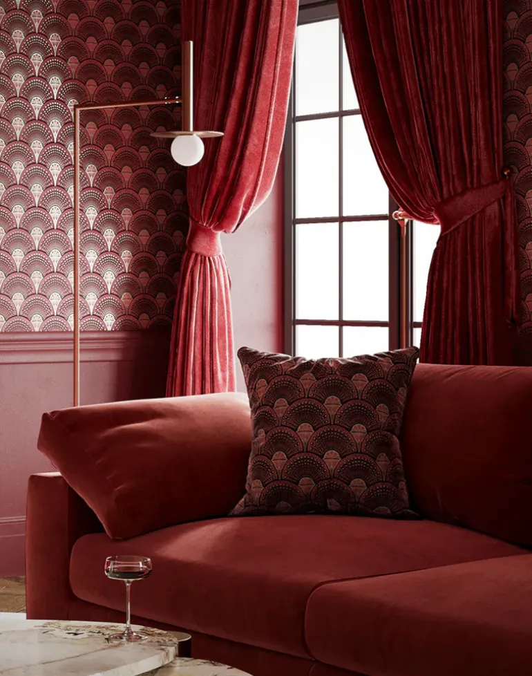 An Art Deco wallpaper that brings Gatsby glamour to your home, in a sultry palette of deep red, black and gold that brings Gatsby glamour, and a touch of Paris cabaret to your home.