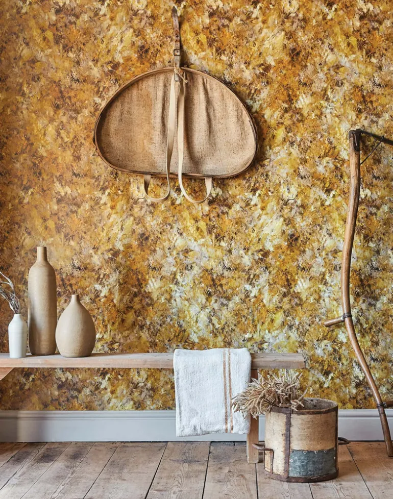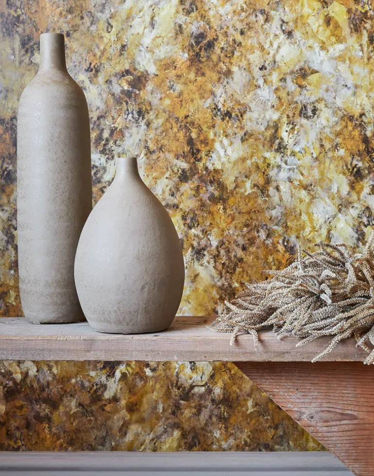 17 Patterns’ Demiurge Wallpaper morphs traditional painting with digital artistry into an abstract crescendo of complex textures and enriched tones. Working in collaboration, British contemporary artists – Paris & Nosca Inc repeatedly convolute pre existing matter to craft a formless composition of painterly gestural marks. Each multiple layer of golden glowing hues delivers a soulful montage of harmonious color and uplifting energy. Developed to coordinate perfectly within both period and modern interiors, Demiurge pulls art out of the picture frame onto an alluring contemporary wallcovering.