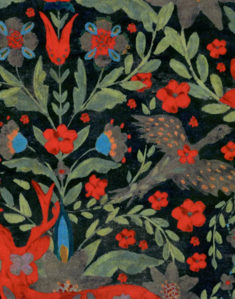 Meaning ‘the king’ DER KÖNIG is a design dominated by the mountains most regal beast. As mystical birds take flight, a herd of crimson stags are camouflaged amongst a carpet of folk-inspired flowers and leaves silhouetted against an inky background as black as midnight sky.