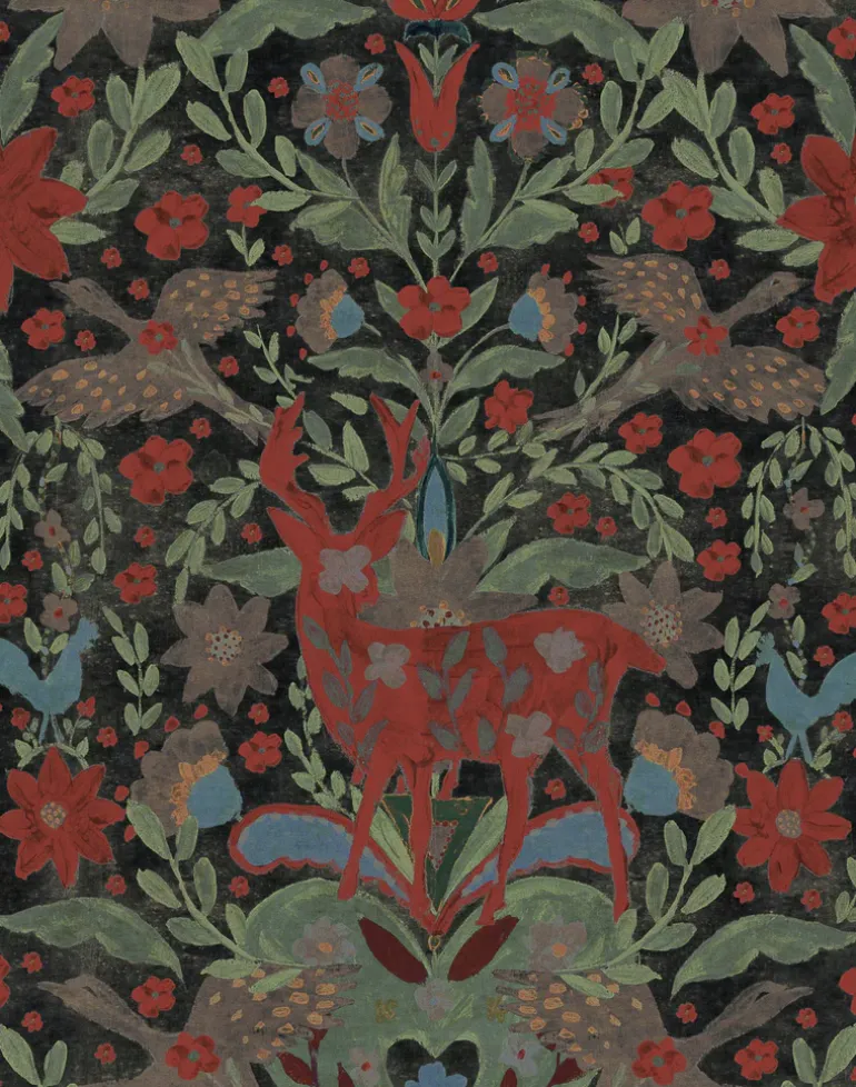 Meaning “the king”, DER KÖNIG is a beautiful hand-painted design dominated by the Tyrolean mountains most regal beast. As mystical birds take flight, a herd of vibrant stags are camouflaged amongst a carpet of folk-inspired flowers and leaves silhouetted against a background as pale as snow or as black as midnight sky.