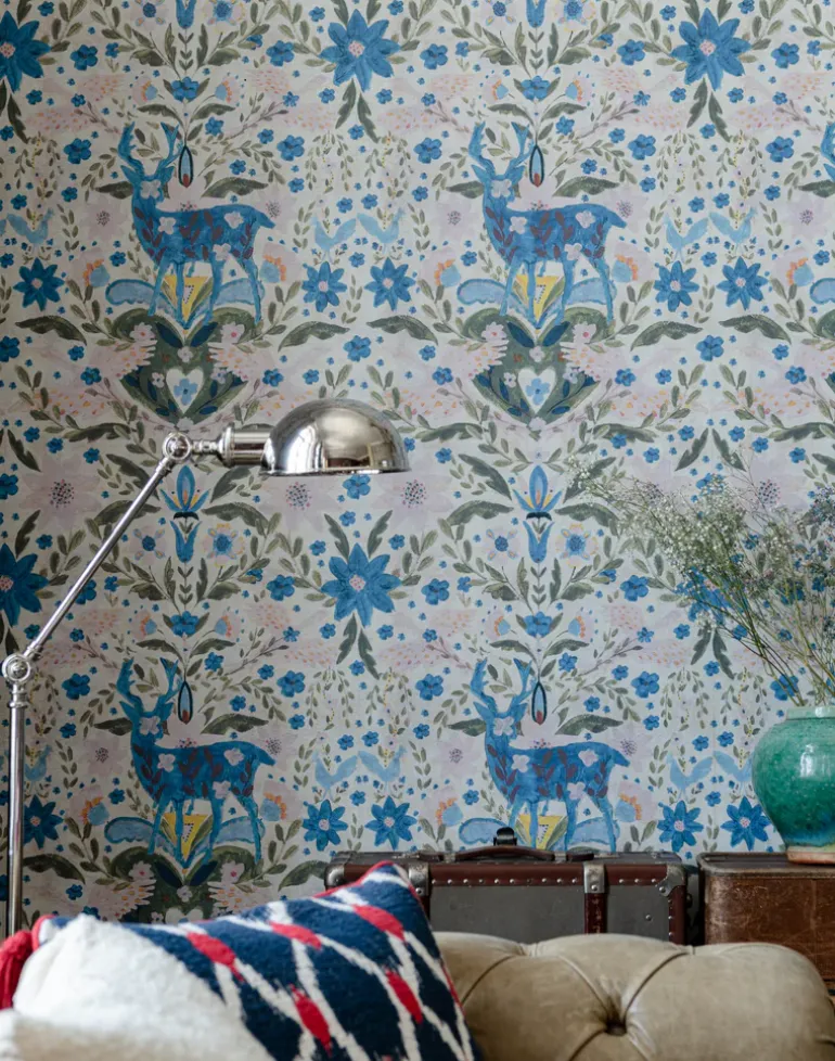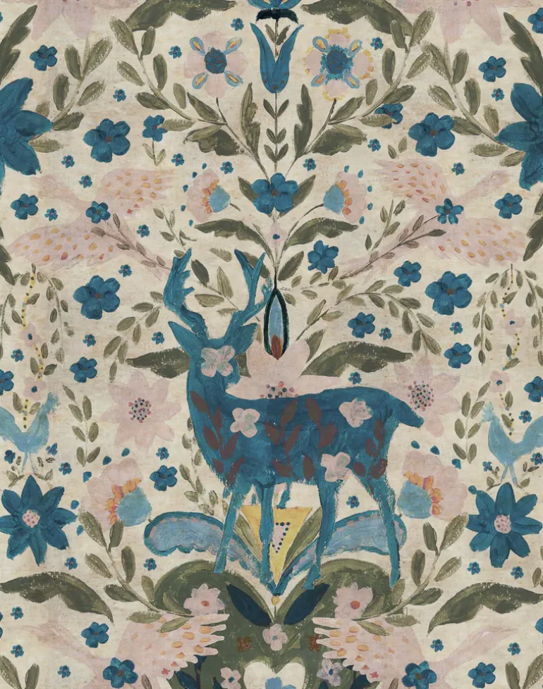 Meaning “the king”, DER KÖNIG is a beautiful hand-painted design dominated by the Tyrolean mountains most regal beast. As mystical birds take flight, a herd of vibrant stags are camouflaged amongst a carpet of folk-inspired flowers and leaves silhouetted against a background as pale as snow or as black as midnight sky.