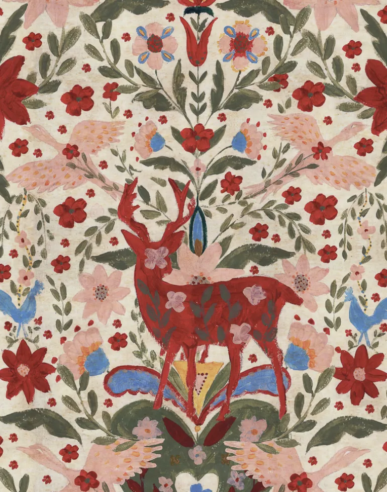 Meaning “the king”, DER KÖNIG is a beautiful hand-painted design dominated by the Tyrolean mountains most regal beast. As mystical birds take flight, a herd of vibrant stags are camouflaged amongst a carpet of folk-inspired flowers and leaves silhouetted against a background as pale as snow or as black as midnight sky.