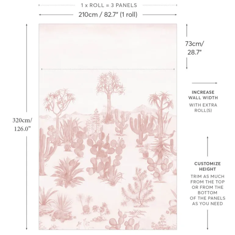 Our Desert Mural Wallpaper depicts a dream-like scene, where arid terrain blooms into a wild desert garden, rich with cacti and verdant vegetation.