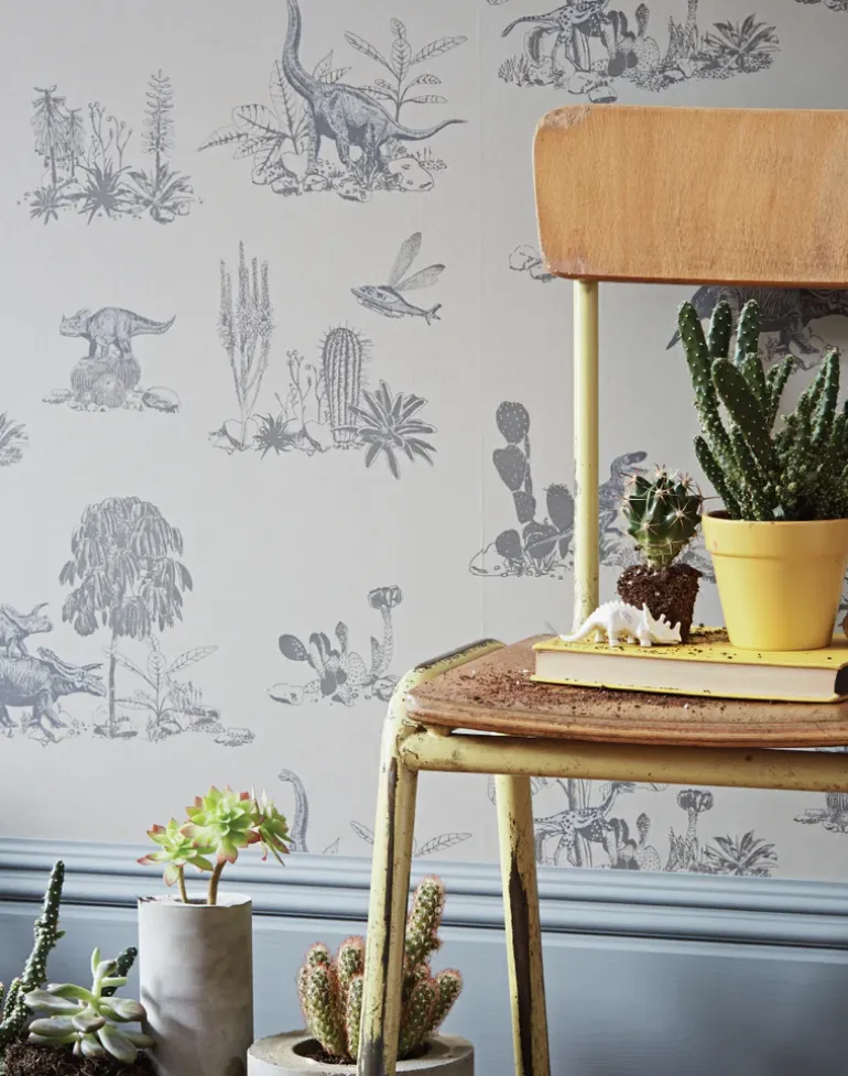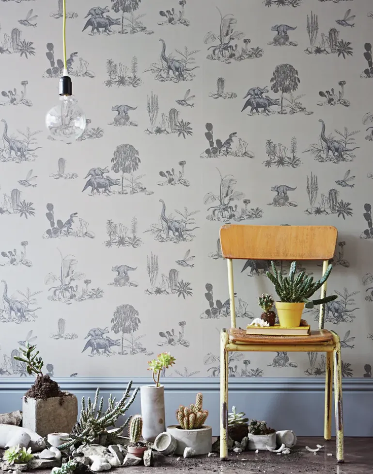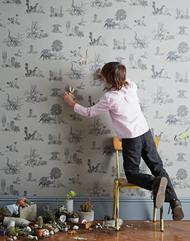 Capture the imagination of nature-loving children and adults alike with a whimsical landscape of desert cactus and roaming dinosaurs for your home. Designed in a muted grey hue for a sophisticated interpretation of our popular Dino design, this quirky printed wallpaper will offer a unique talking point for both traditional and modern interiors.