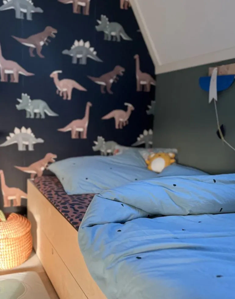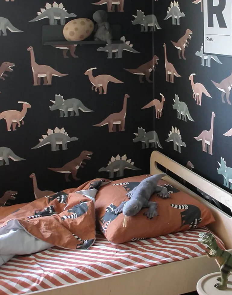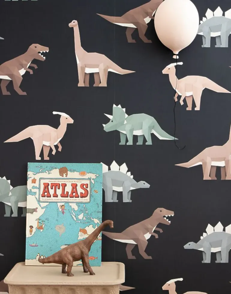 Studio Ditte dinosaur wallpaper. Wallpaper for kids who love the Tyrannosaurus rex, Triceratops or Brachiosaurus. The dinosaurs are handmade from paper and give the wallpaper a nice subtle 3D effect. Together the dinosaurs form a beautiful color palette on a dark background. Perfect wallpaper for a dino lover’s children’s room.