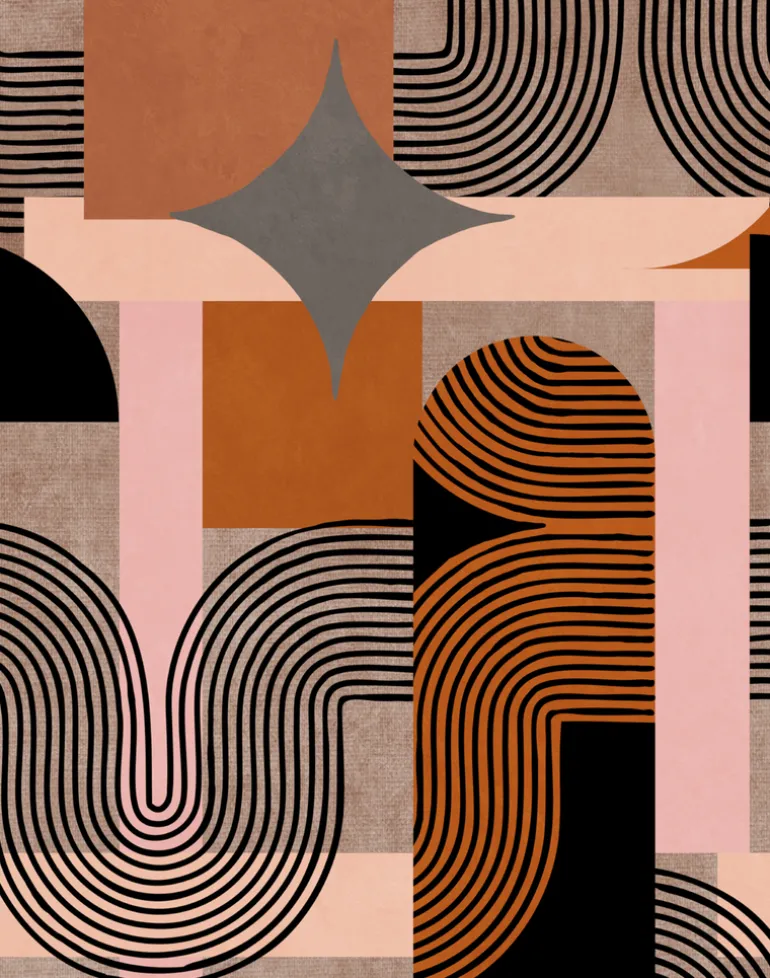 Burnt orange, black, and taupe illustration on peachy pink background