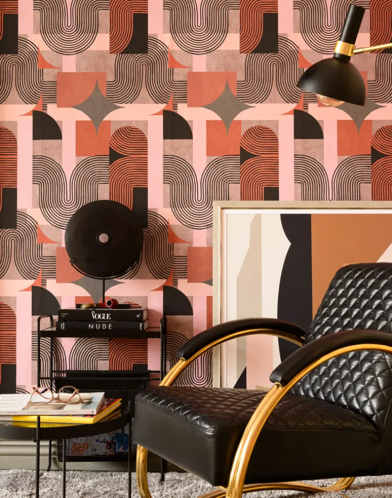 A simple and stylish design with a modern look and soft tone colors inspired by the Mid-Century movement. A sophisticated pattern with geometric elements and large curved stripes in contrasting colors creates a contemporary wallpaper with retro vibes.