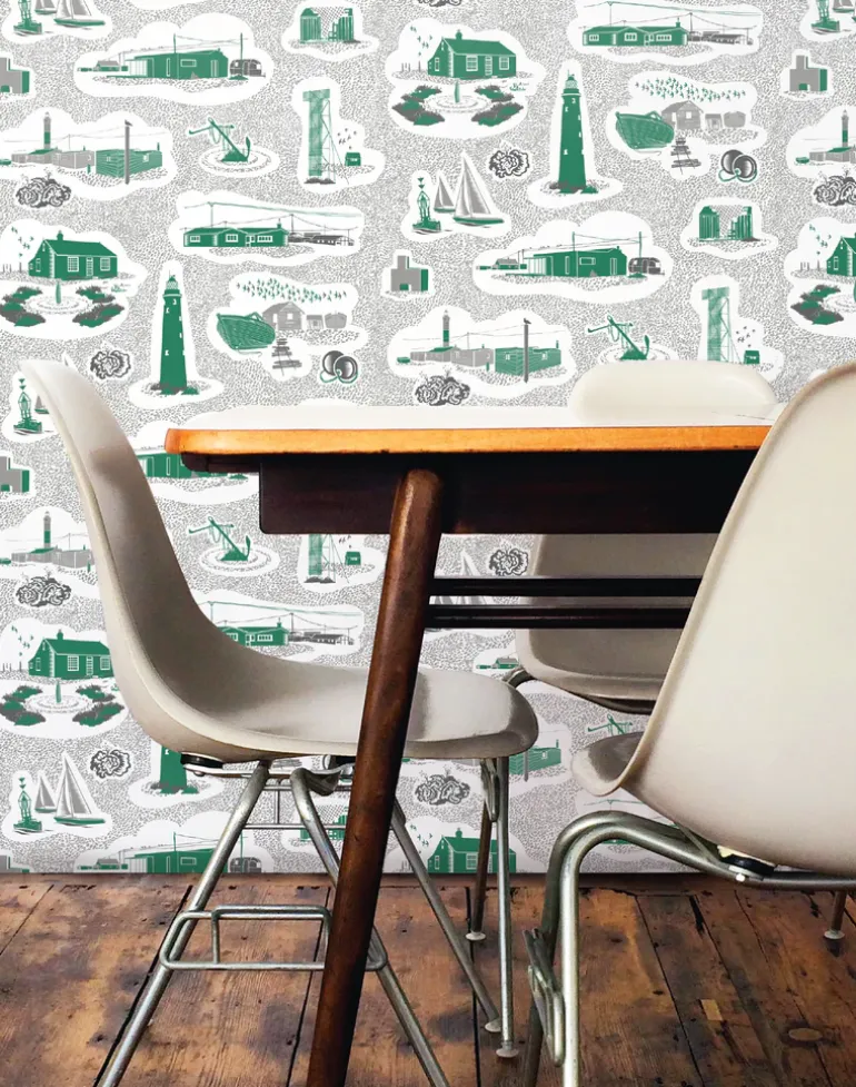 The first wallpaper in the 2014 Hinterland collection, Dungeness features a mass of shingle, punctuated by illustrated vignettes of quaint cabins, abandoned fishing boats and ramshackle huts. Anchoring the print are the two lighthouses that flank the Mini Moderns beach house.