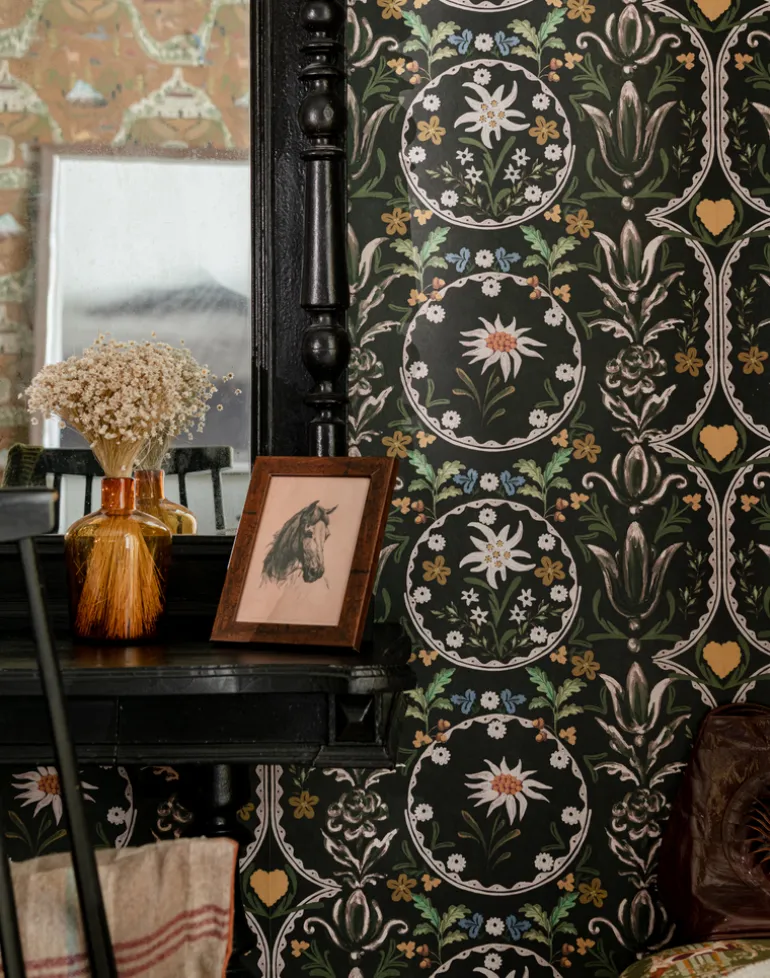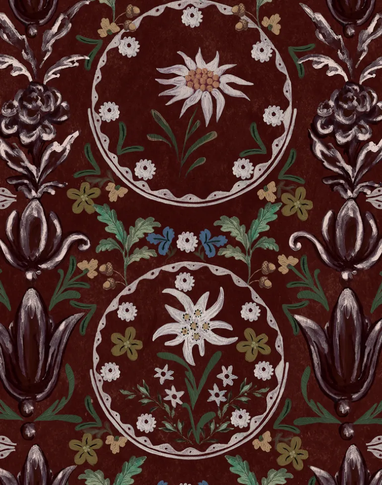 No other flower speaks more of the mountains than EDELWEISS, one of the floral symbols of Tyrol. The delicate star-shaped flower, a member of the daisy family, is encircled on this pretty paper as if framed in an embroidery ring. Intertwined with oak leave and edged by lacy borders, the green and red color ways make the painterly pattern sing.