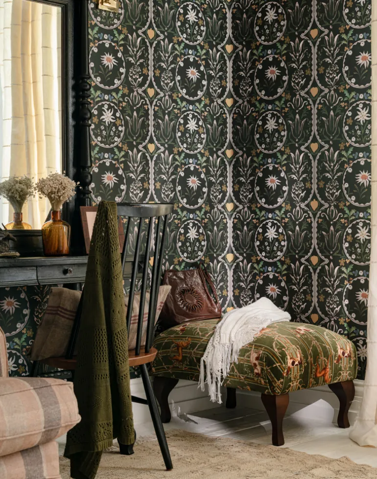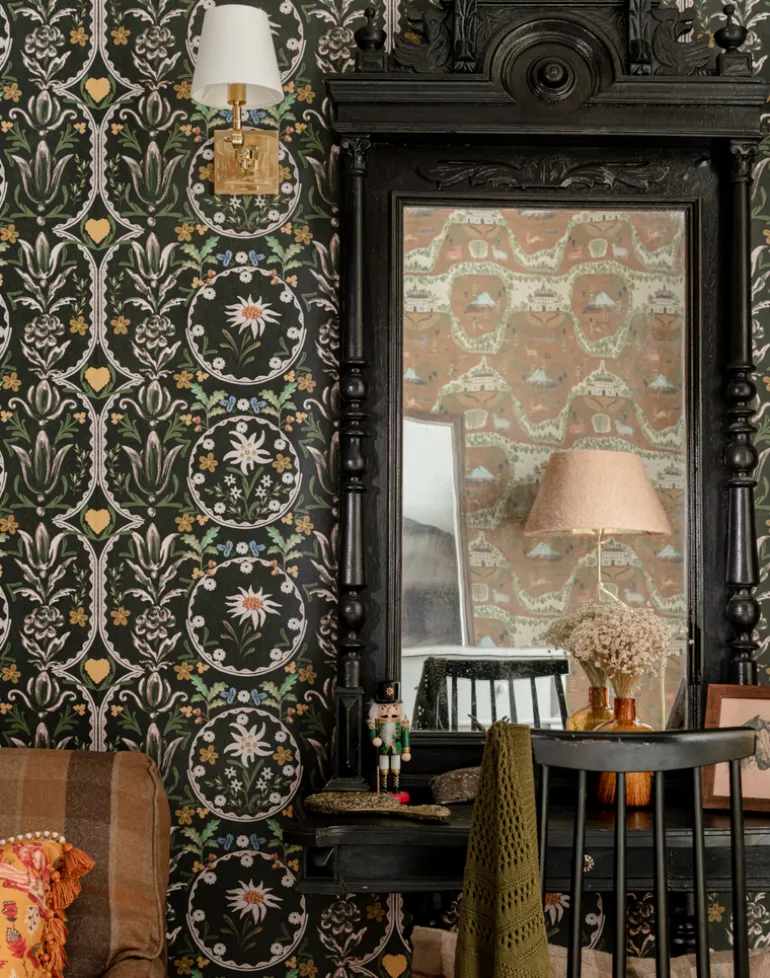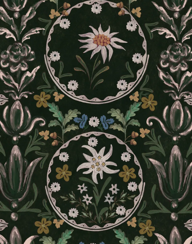 No other flower speaks more of the mountains than EDELWEISS, one of the floral symbols of Tyrol. The delicate star-shaped flower, a member of the daisy family, is encircled on this pretty paper as if framed in an embroidery ring. Intertwined with oak leave and edged by lacy borders, the green and red color ways make the painterly pattern sing.