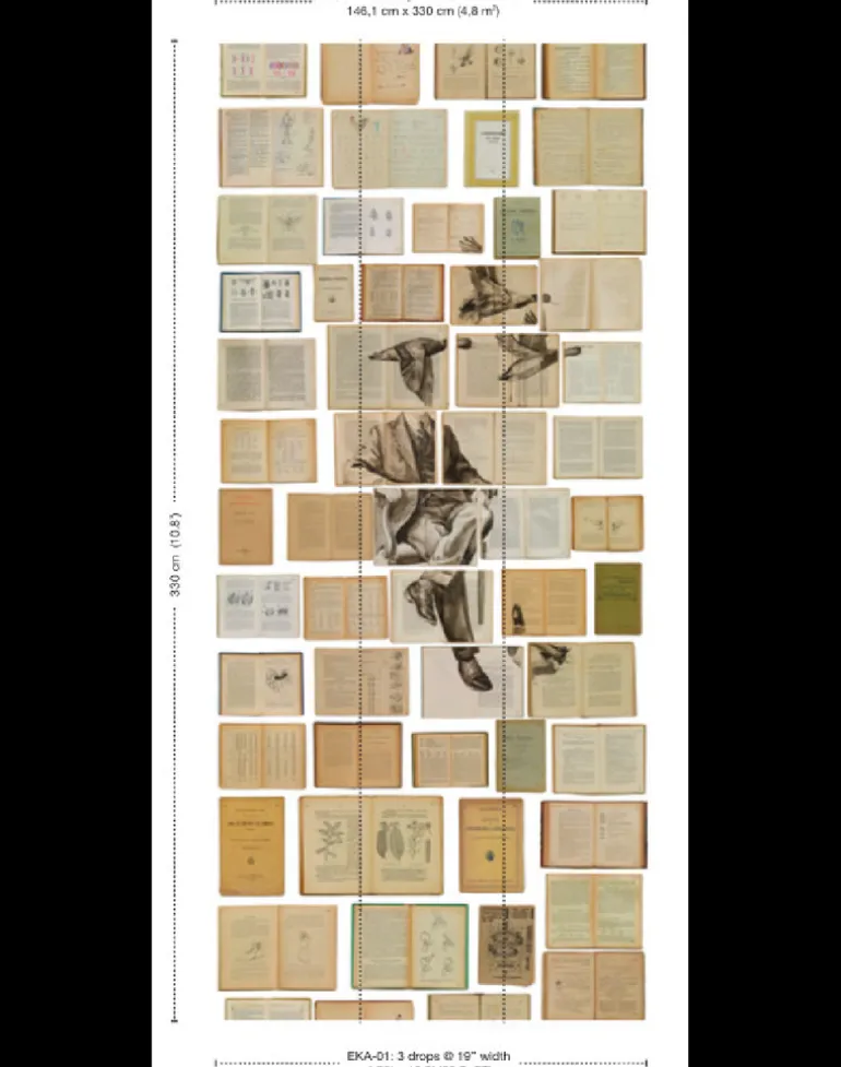 The middle of this wallpaper is a mural of 3 drops. This is installed in the middle of the wall. On the sides you can add a roll that only contains books. EKA-07 is the white variant with books only, EKA-08 comprises black books. The mural is 3 drops, the rolls are 2 drops (see below for sizes).