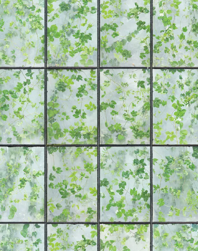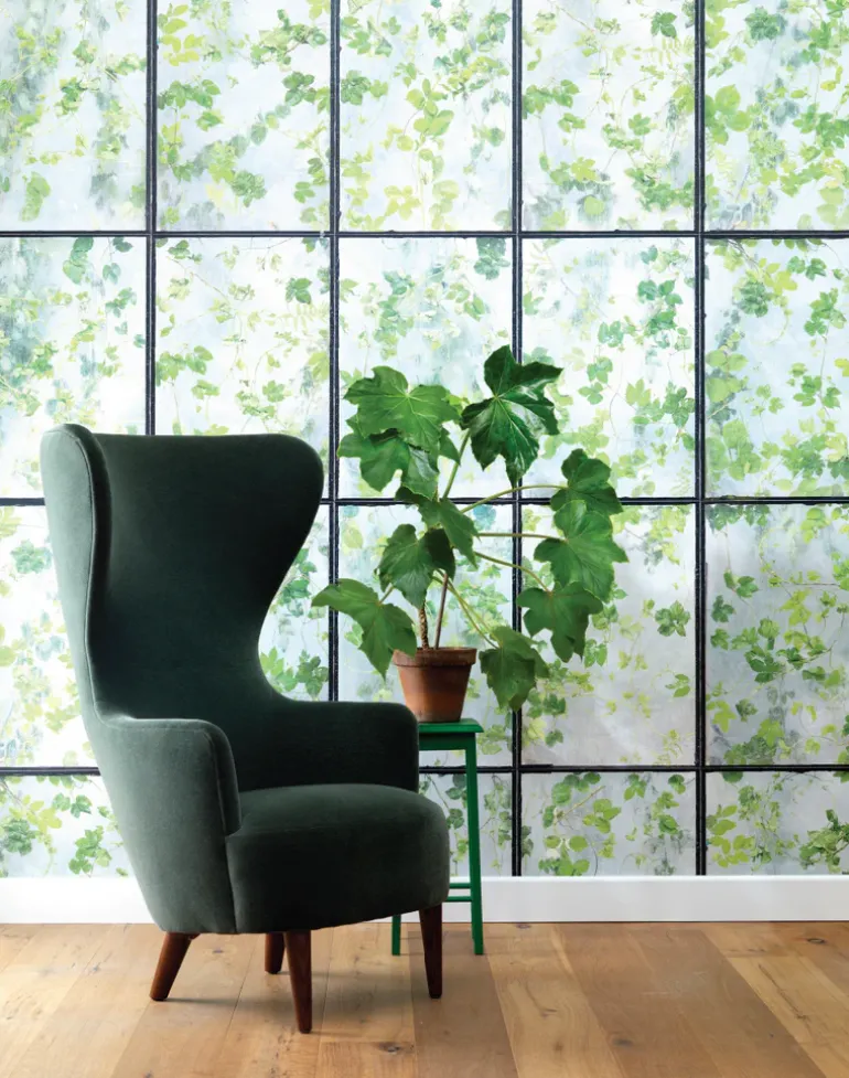 The greenhouse windows on the wallpaper resemble a framework through which you can see the green landscape. This way, you can turn a solid wall into a kind of greenhouse making you look outside. Or you can see it as getting the green into your home.