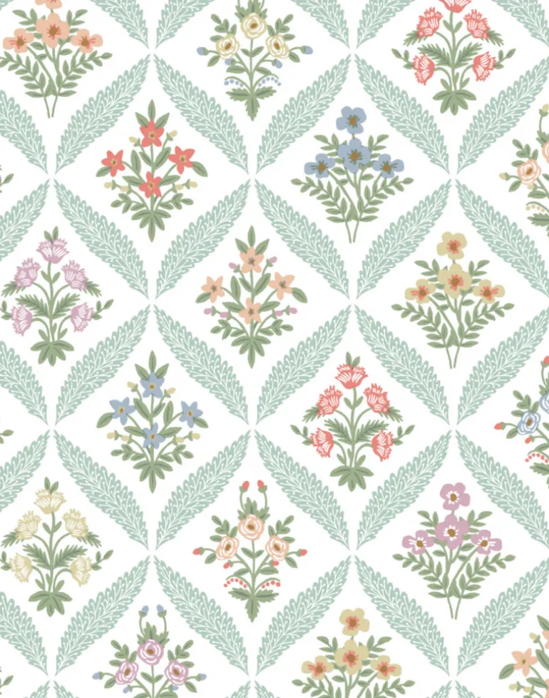 Filigree leaves create a crosshatch grid filled with botanicals on our Estee Garden wallpaper.