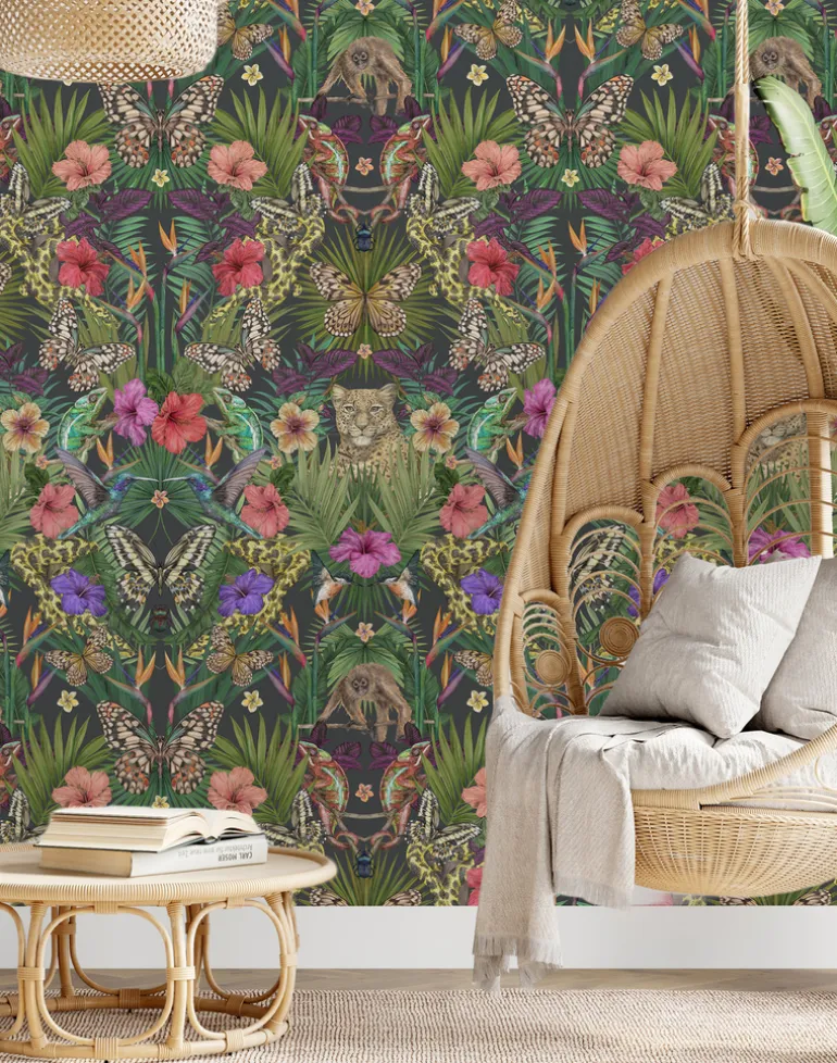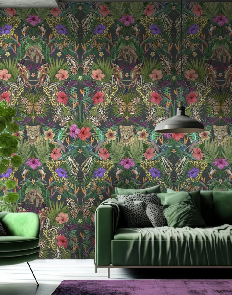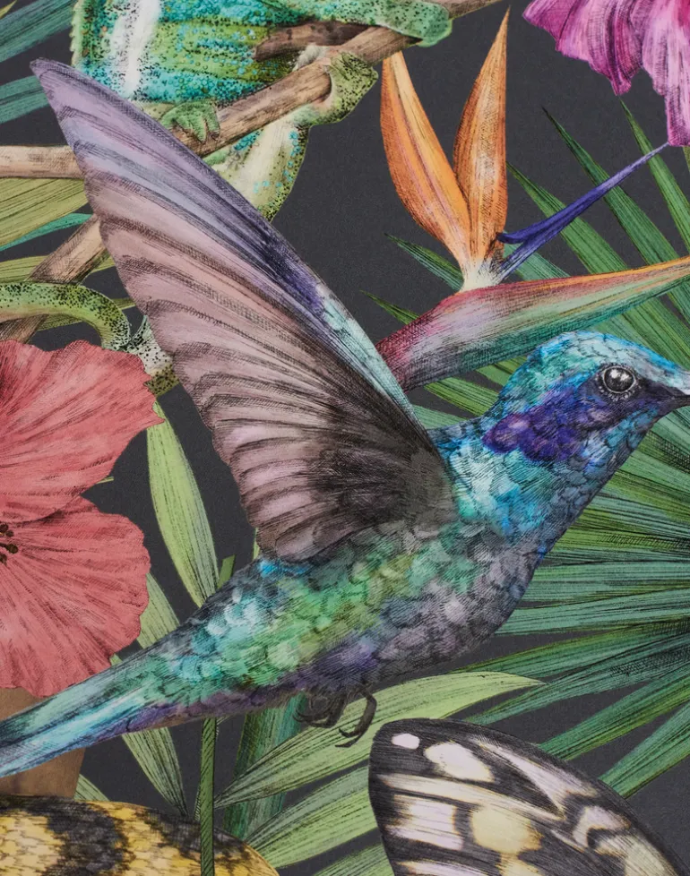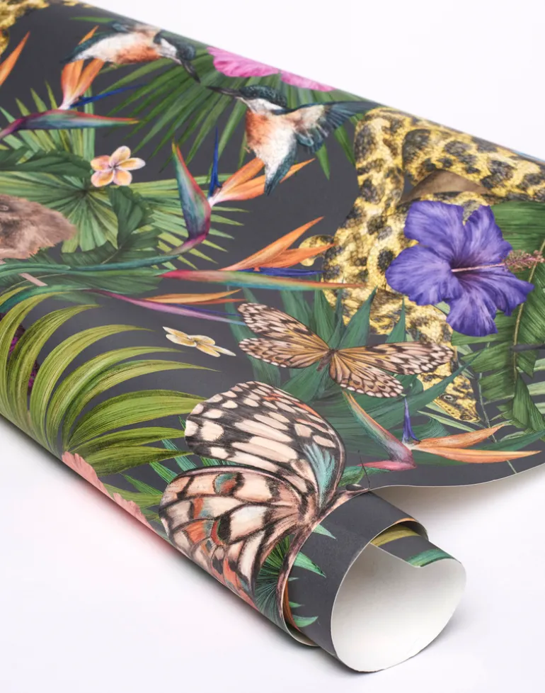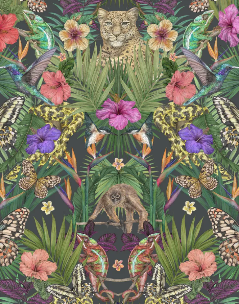Step into the dark exotic underworld of the jungle. The deep ultraviolet spectrum highlights the hidden creatures and exotic flora exquisitely hand drawn, across this exuberant mirage.