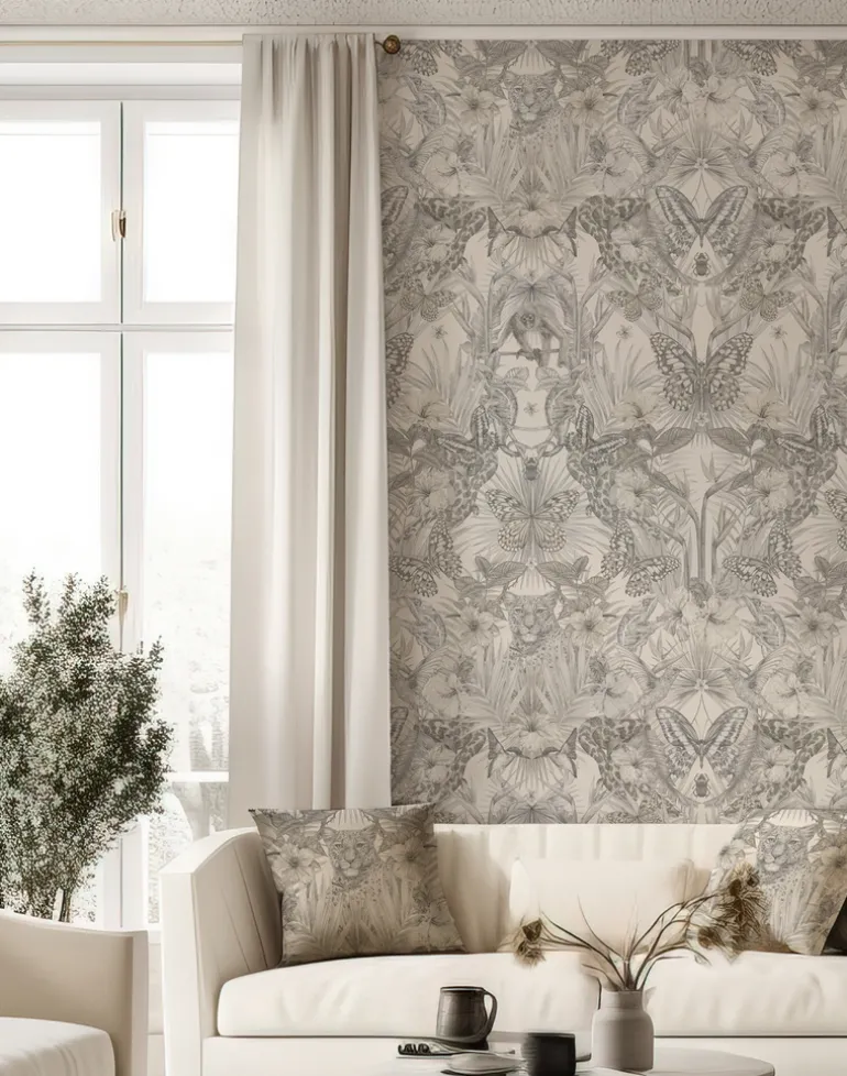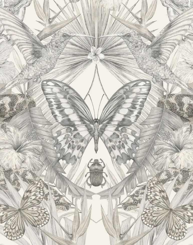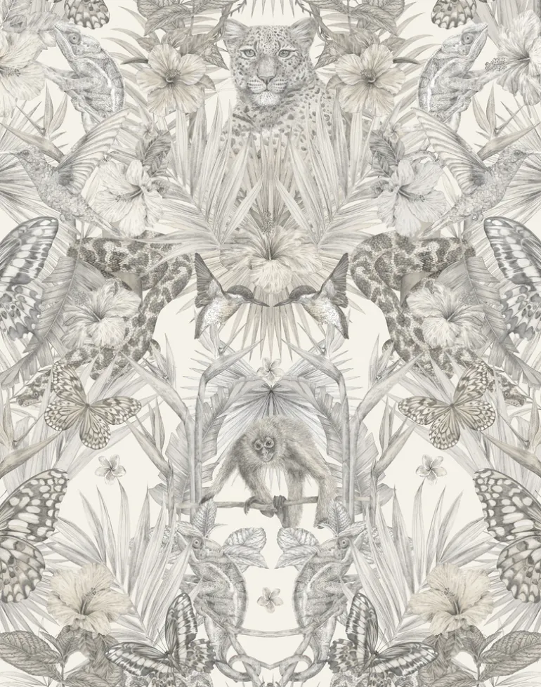 The ‘Exotica’ mural design transports you into a rich, eclectic jungle utopia. A feast for the eyes, this highly intricate and detailed hand drawn design, incorporates a vast array of wildlife, flora and fauna to create this structured and impactful mirage. The parchment color way shows off our exceptionally detailed hand drawings in their natural charcoal tone, highlighted by soft parchment shades; extremely chic and timeless.