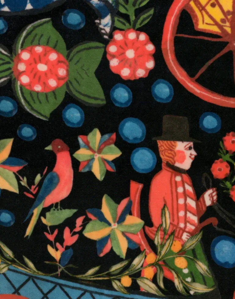 Be transported directly to the wondrous Carnival of Innsbruck with FASNACHT, an explosion of pattern that embodies the spirit of Tyrol’s favorite festival. A parade of colorful carriages, top hatted coachmen and high stepping horses trot across this dramatic black velvet, all intertwined with folkloric flowers and handsome peacocks.