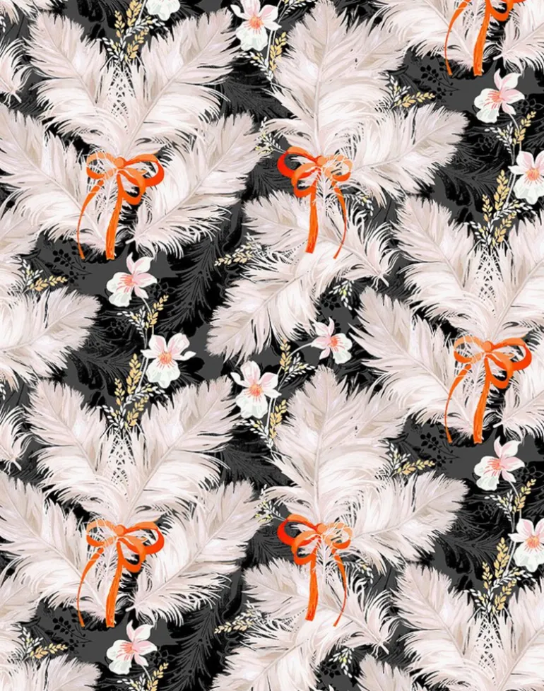 Feathered Folly vintage style wallpaper is an archive design reimagined in dark moody colors for a captivating and dramatic effect. The dark and moody color palette will add an opulent touch to any space.