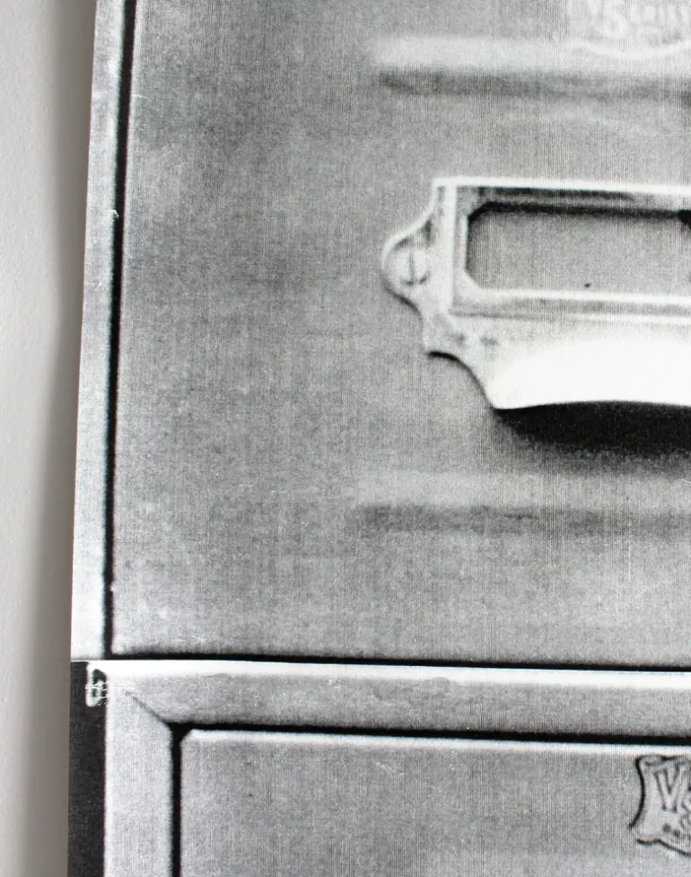 Deborah has produced an extensive range of individual, non-repeat wallpaper designs. These began with her graduation installation of ‘Hooks & Frocks’ which incorporates photographs of hanging dresses, montaged together and then machine printed at life-size onto drops of wallpaper. The monochrome images are brought to life by adding silkscreened color and hand painted detail, creating a homage to trompe l’oeil and deliberately shunning the repeat pattern. Deborah’s intention is for her work to interact quietly and playfully with objects and furniture, but not dominate the surrounding environment.