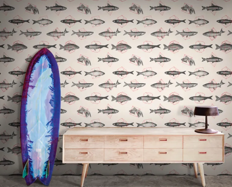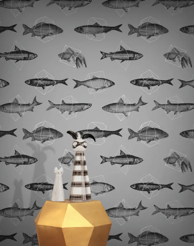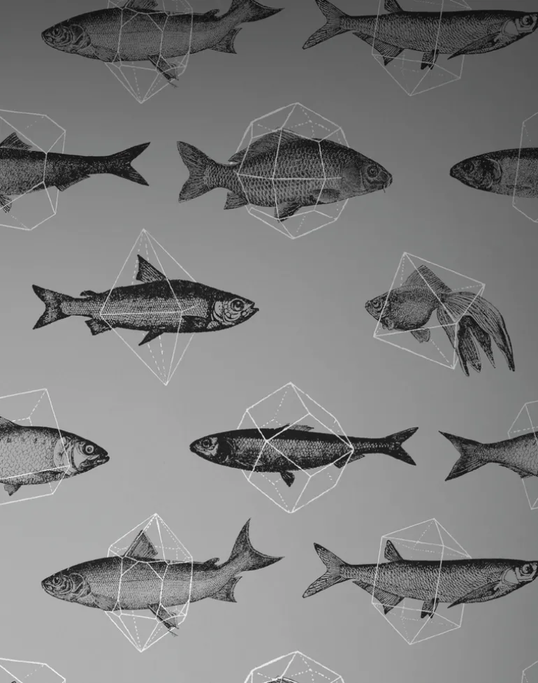 A striking modern designer wallpaper, built around fish trapped in geometric shapes.