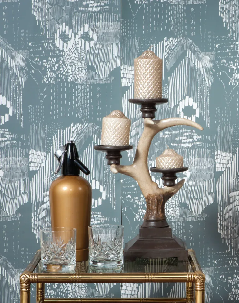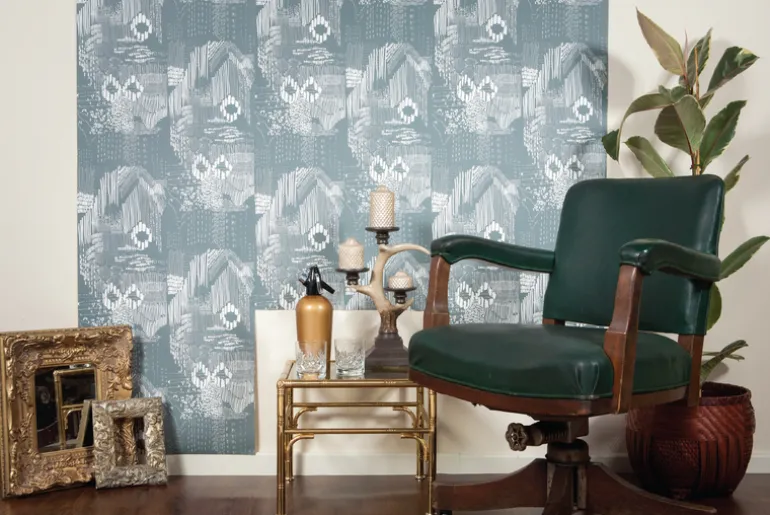 Gold colored design digitally printed onto a pearl shine wallpaper, giving a metallic gold effect. Featuring experimental mark making using various mediums.