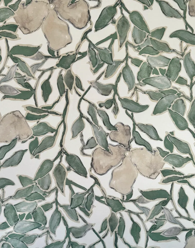 A hand painted floral combines romance and style with oversized blooms over meandering leaves.