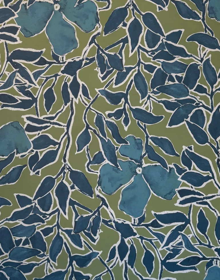 A hand painted floral combines romance and style with oversized blooms over meandering leaves.
