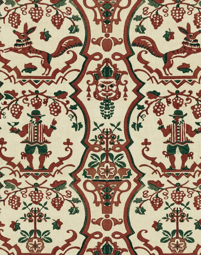 Simple in palette but intricate in detail, FLORICSOME layers a two-color folk design on top of a contrasting ground. Look closely at this print-like paper and discover frisky foxes with brush-like tails, as well as traditional masks, vines laden with fruit, and a Tyrolean character in Lederhosen pants and hat charging his festive glass.